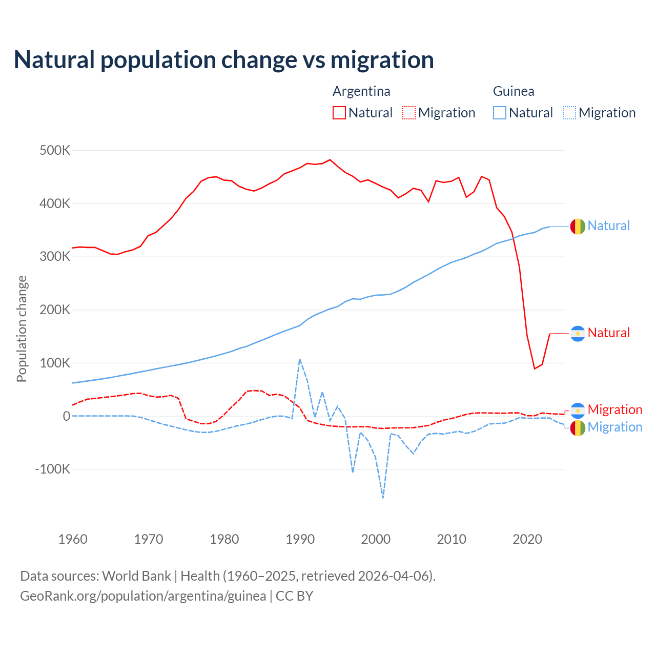 Over the last 10 years, 98.5% of the population change in Argentina is from natural causes (a gain of 2,779,031 people) and 1.52% is from migration (a gain of 42,871 people). In Guinea 97.2% is from natural causes (a gain of 3,346,936 people) and 2.76% is from migration (a loss of 94,924 people).