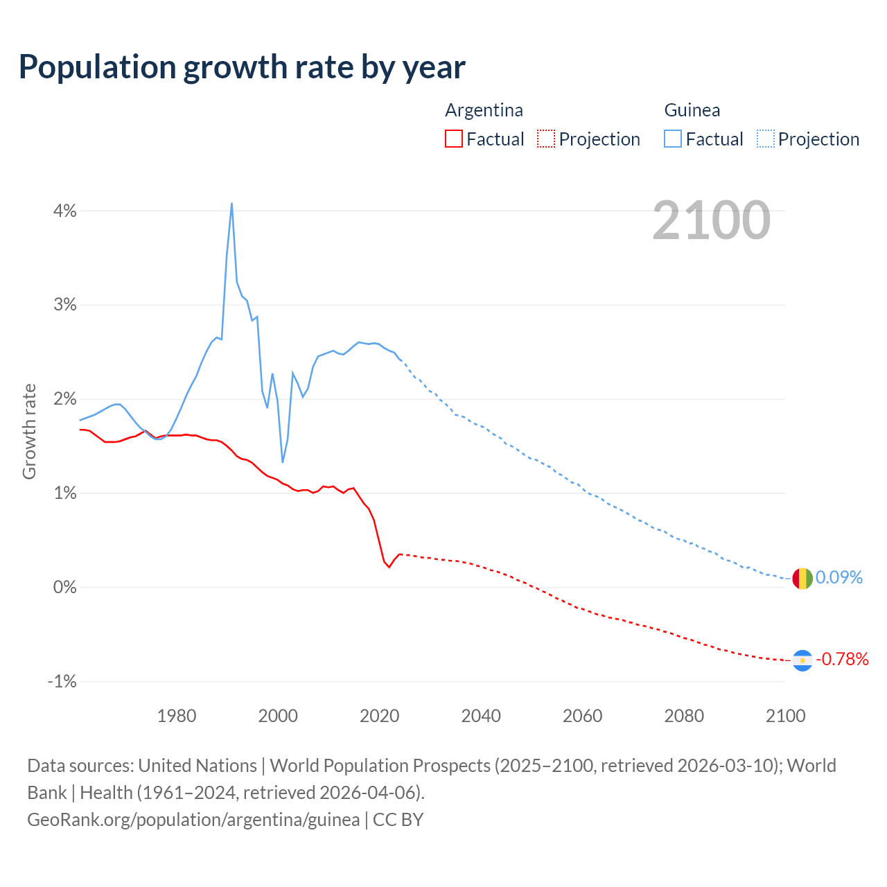 Argentina vs Guinea: population by year and forecast