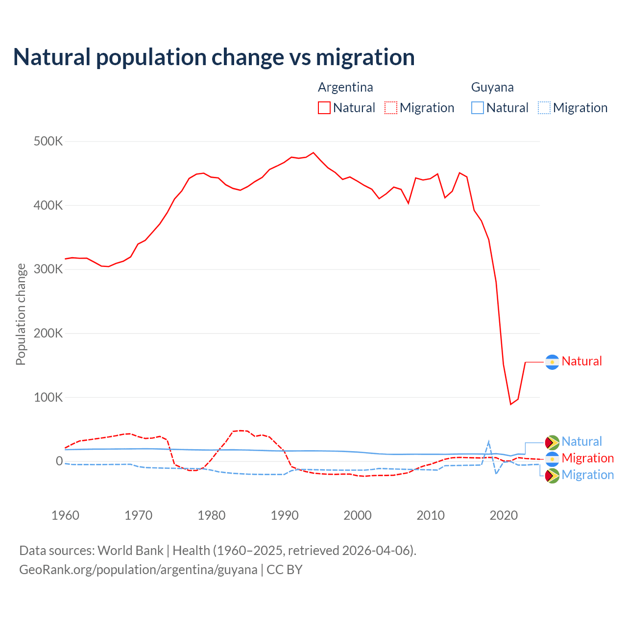 Over the last 10 years, 98.5% of the population change in Argentina is from natural causes (a gain of 2,779,031 people) and 1.52% is from migration (a gain of 42,871 people). In Guyana 77.7% is from natural causes (a gain of 107,419 people) and 22.3% is from migration (a loss of 30,797 people).