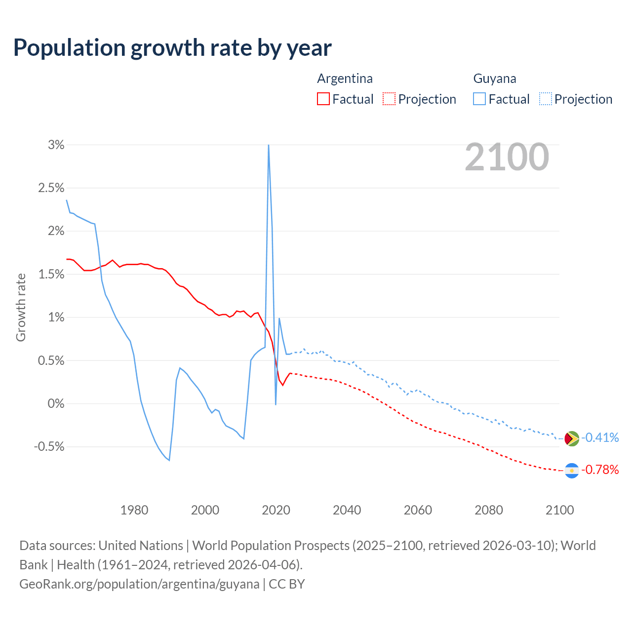 - For the last 10 years, Argentina has had an average growth rate of +0.64% per year vs +0.94% in Guyana.