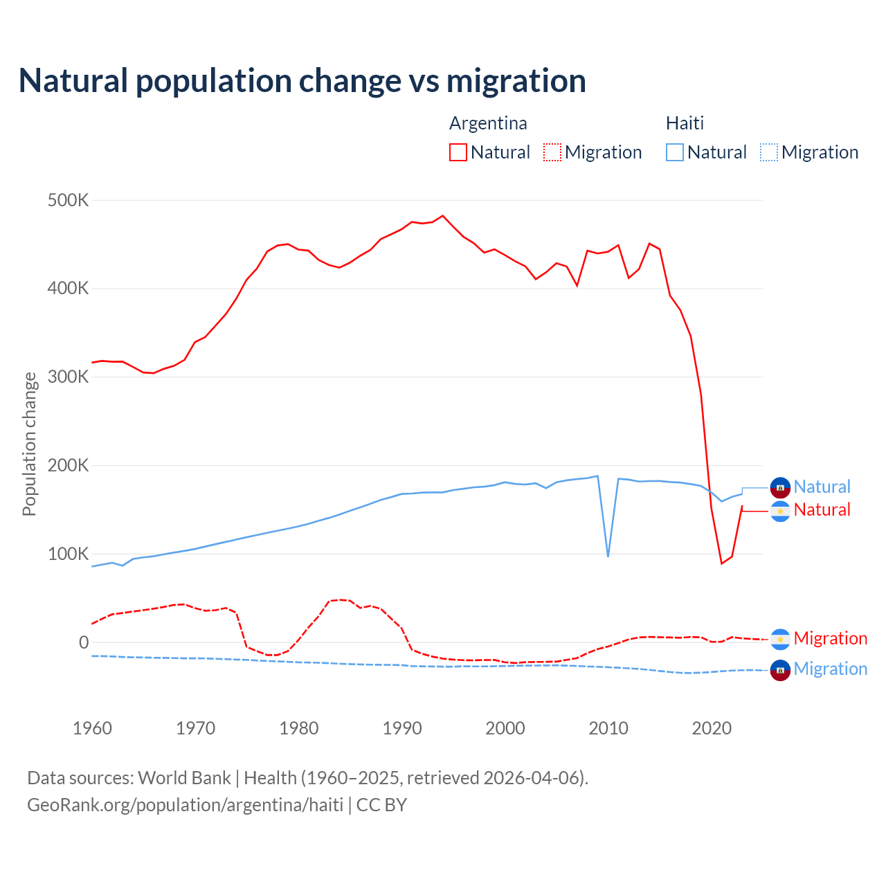 Over the last 10 years, 98.5% of the population change in Argentina is from natural causes (a gain of 2,779,031 people) and 1.52% is from migration (a gain of 42,871 people). In Haiti 83.9% is from natural causes (a gain of 1,740,319 people) and 16.1% is from migration (a loss of 333,076 people).