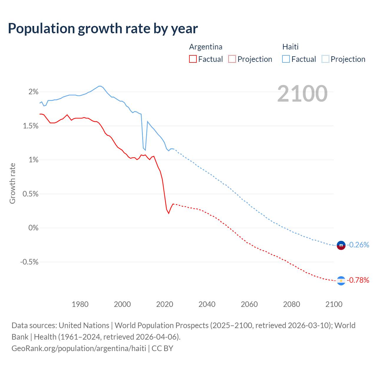 - For the last 10 years, Argentina has had an average growth rate of +0.64% per year vs +1.29% in Haiti.