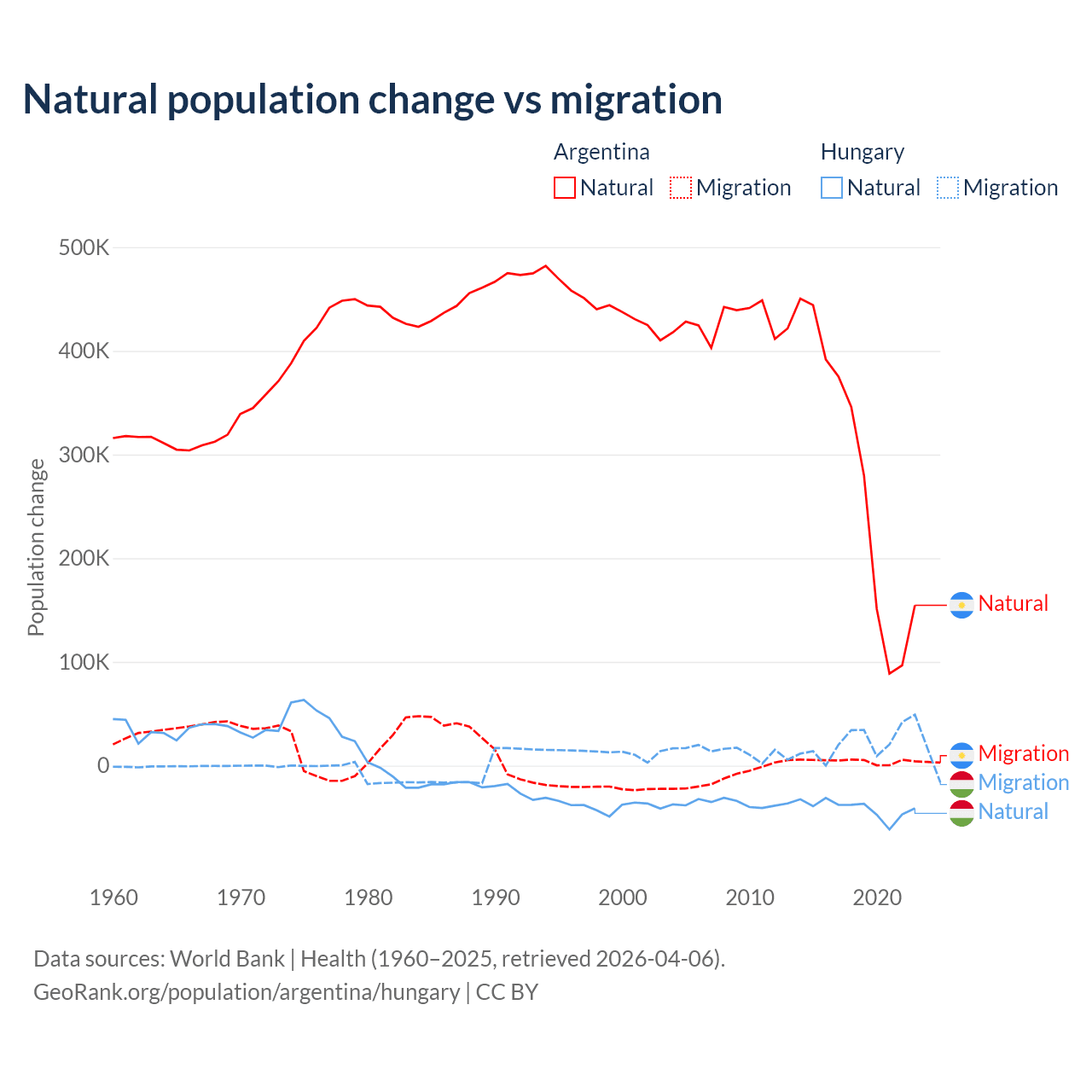 Over the last 10 years, 98.5% of the population change in Argentina is from natural causes (a gain of 2,779,031 people) and 1.52% is from migration (a gain of 42,871 people). In Hungary 63.7% is from natural causes (a loss of 412,838 people) and 36.3% is from migration (a gain of 234,837 people).