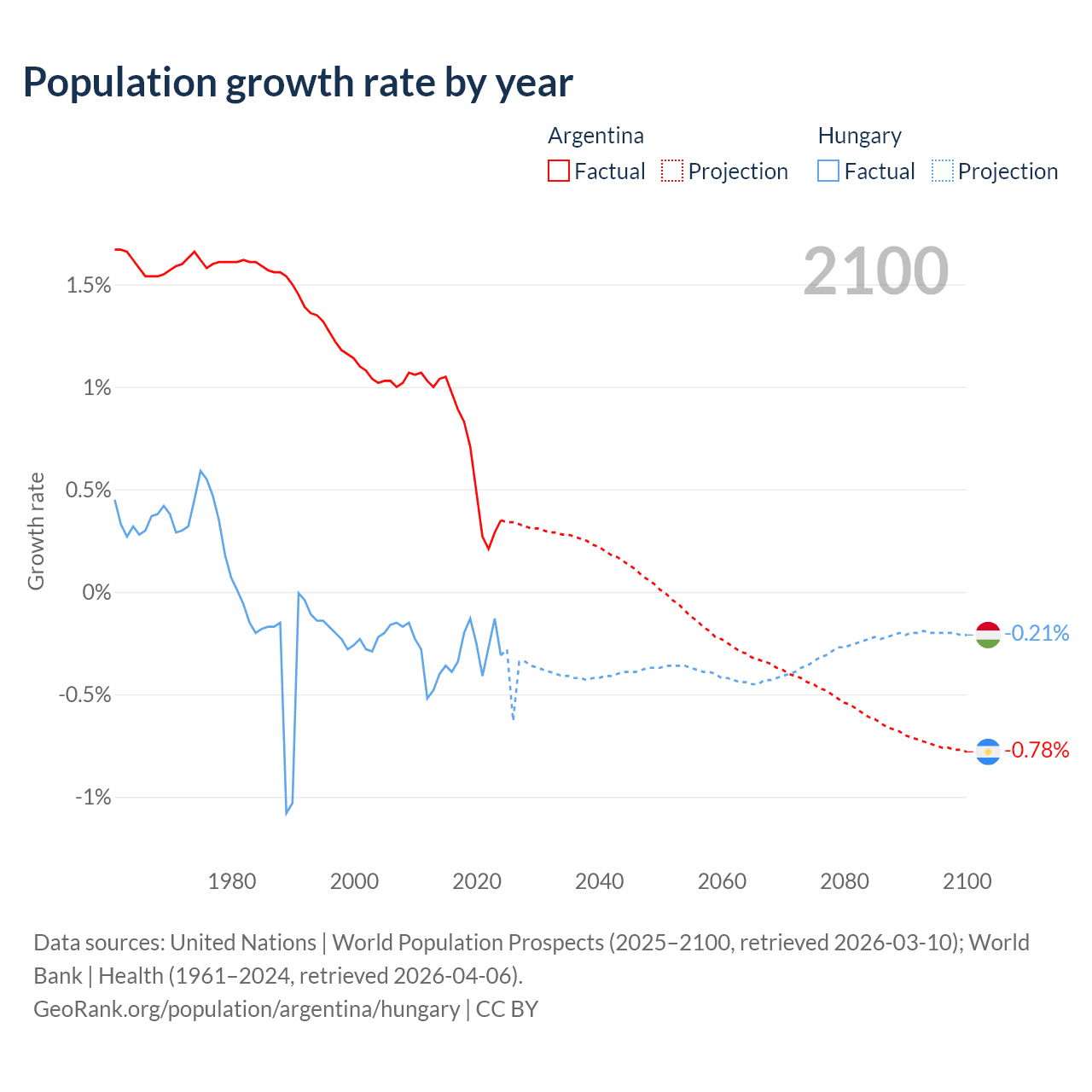 - For the last 10 years, Argentina has had an average growth rate of +0.64% per year vs -0.29% in Hungary.