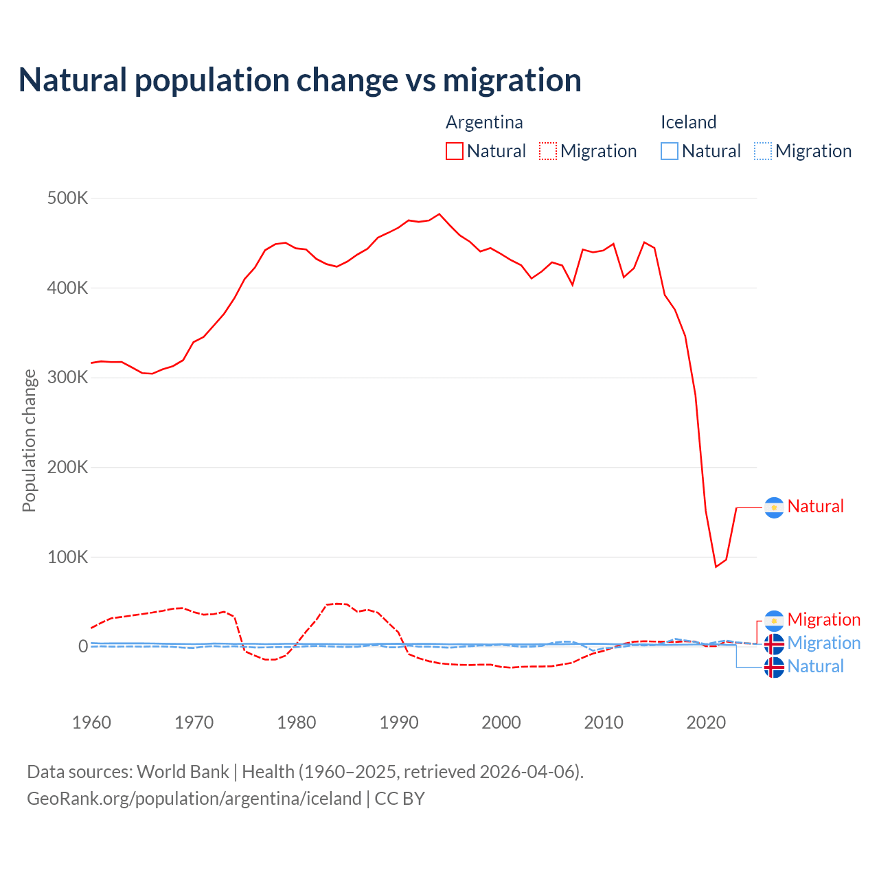 Over the last 10 years, 98.5% of the population change in Argentina is from natural causes (a gain of 2,779,031 people) and 1.52% is from migration (a gain of 42,871 people). In Iceland 30.7% is from natural causes (a gain of 20,128 people) and 69.3% is from migration (a gain of 45,356 people).