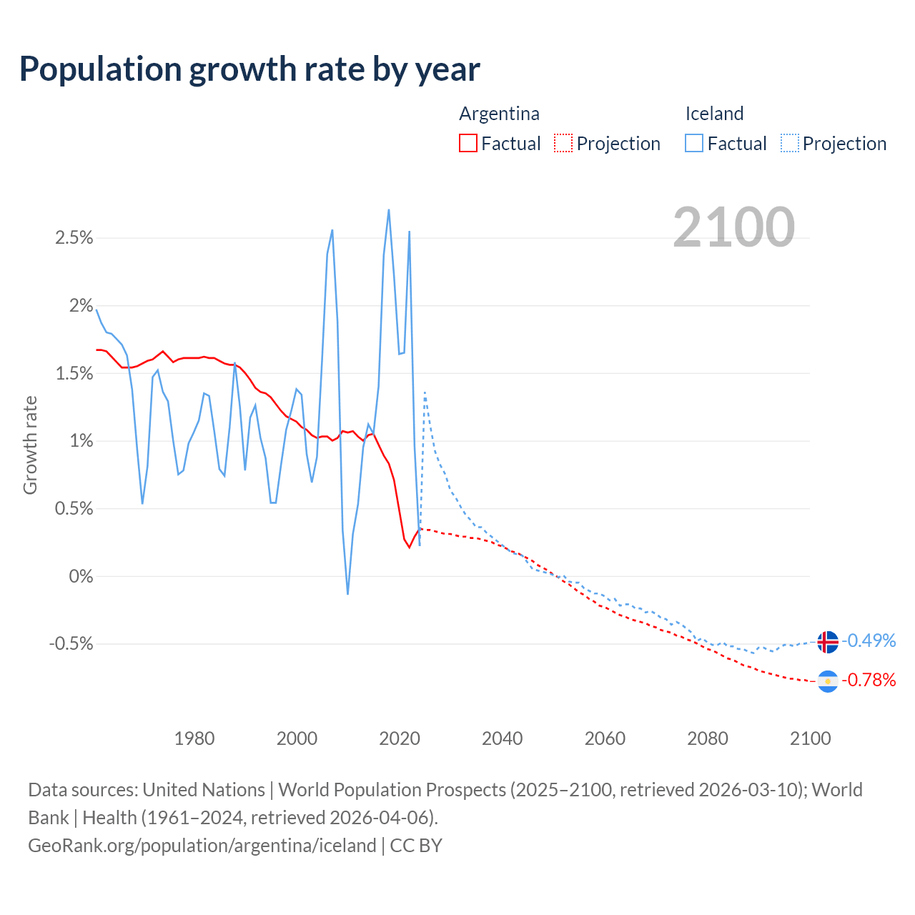 - For the last 10 years, Argentina has had an average growth rate of +0.64% per year vs +1.63% in Iceland.