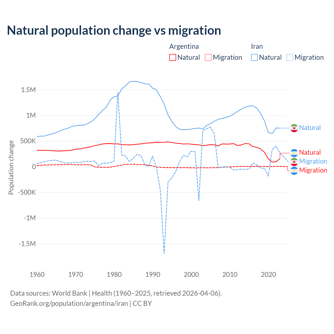 Over the last 10 years, 98.5% of the population change in Argentina is from natural causes (a gain of 2,779,031 people) and 1.52% is from migration (a gain of 42,871 people). In Iran 92.5% is from natural causes (a gain of 9,405,860 people) and 7.46% is from migration (a gain of 757,979 people).