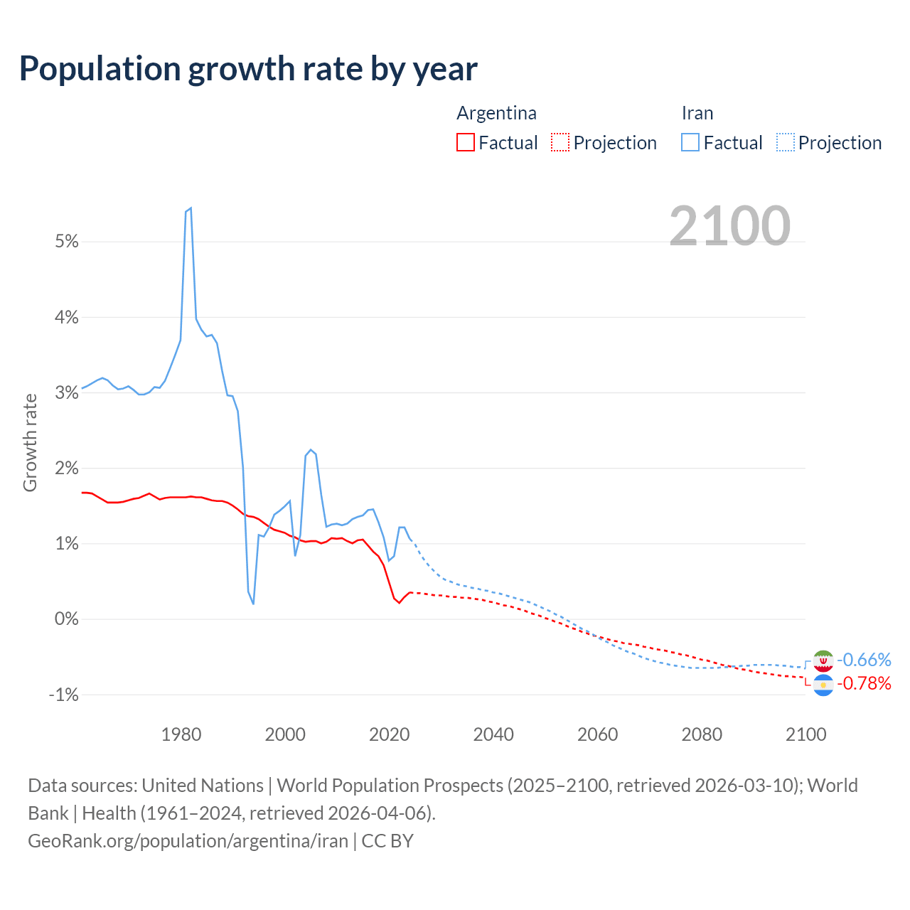- For the last 10 years, Argentina has had an average growth rate of +0.64% per year vs +1.19% in Iran.