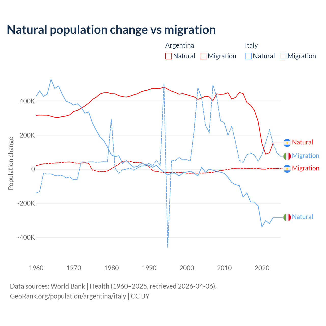 Over the last 10 years, 98.5% of the population change in Argentina is from natural causes (a gain of 2,779,031 people) and 1.52% is from migration (a gain of 42,871 people). In Italy 68.6% is from natural causes (a loss of 2,239,084 people) and 31.4% is from migration (a gain of 1,026,128 people).