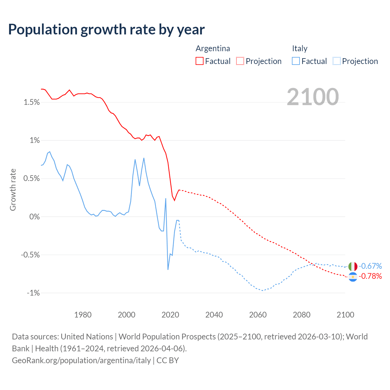 - For the last 10 years, Argentina has had an average growth rate of +0.64% per year vs -0.21% in Italy.
