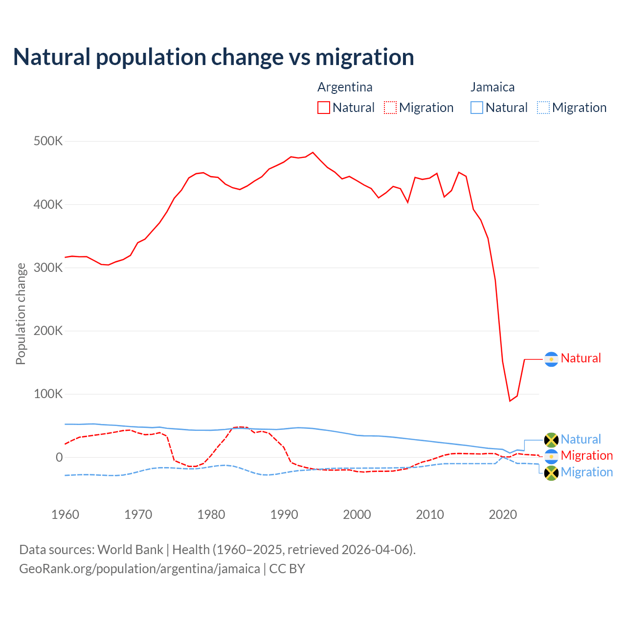 Over the last 10 years, 98.5% of the population change in Argentina is from natural causes (a gain of 2,779,031 people) and 1.52% is from migration (a gain of 42,871 people). In Jamaica 61.3% is from natural causes (a gain of 137,465 people) and 38.7% is from migration (a loss of 86,681 people).