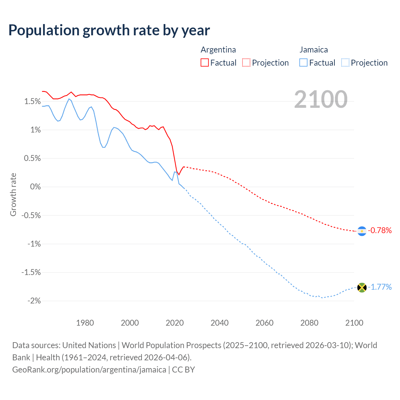 Argentina vs Jamaica: population by year and forecast