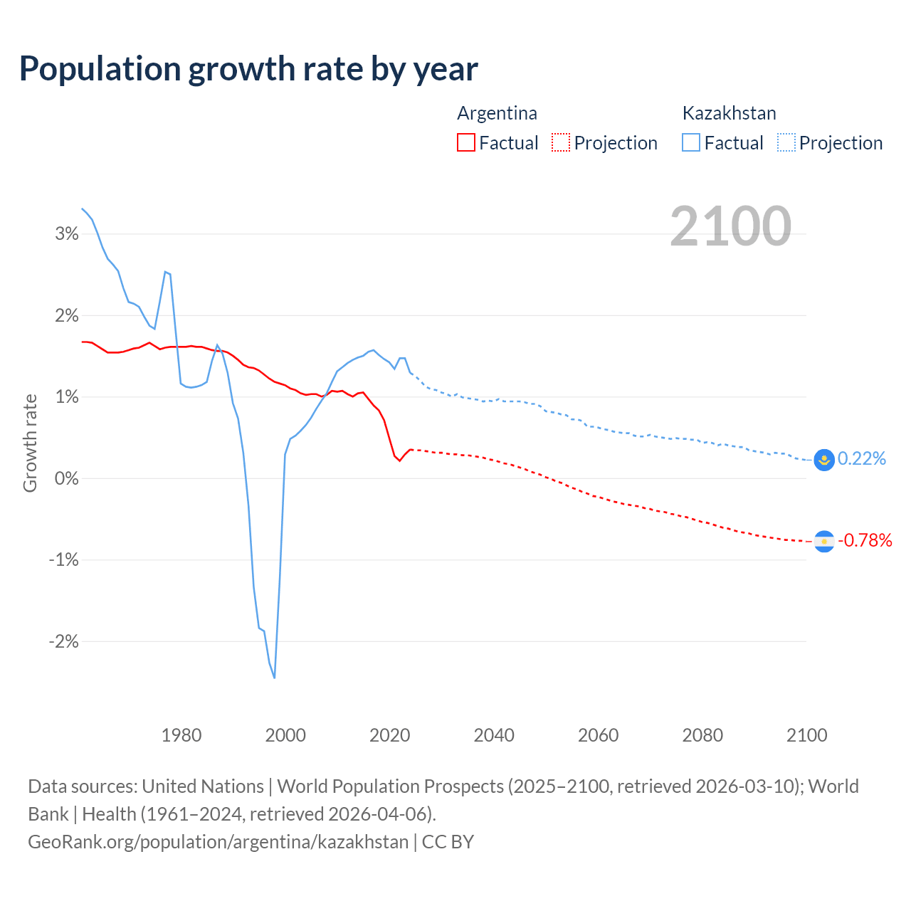 - For the last 10 years, Argentina has had an average growth rate of +0.64% per year vs +1.46% in Kazakhstan.