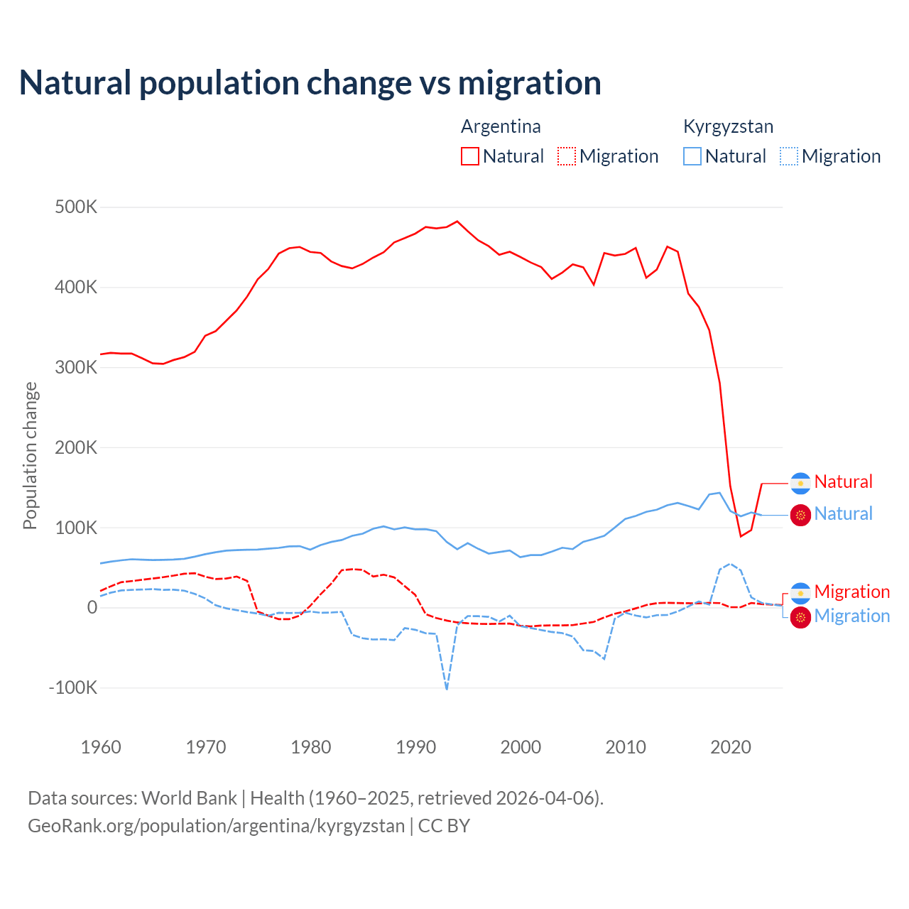 Over the last 10 years, 98.5% of the population change in Argentina is from natural causes (a gain of 2,779,031 people) and 1.52% is from migration (a gain of 42,871 people). In Kyrgyzstan 88.5% is from natural causes (a gain of 1,258,837 people) and 11.5% is from migration (a gain of 164,132 people).
