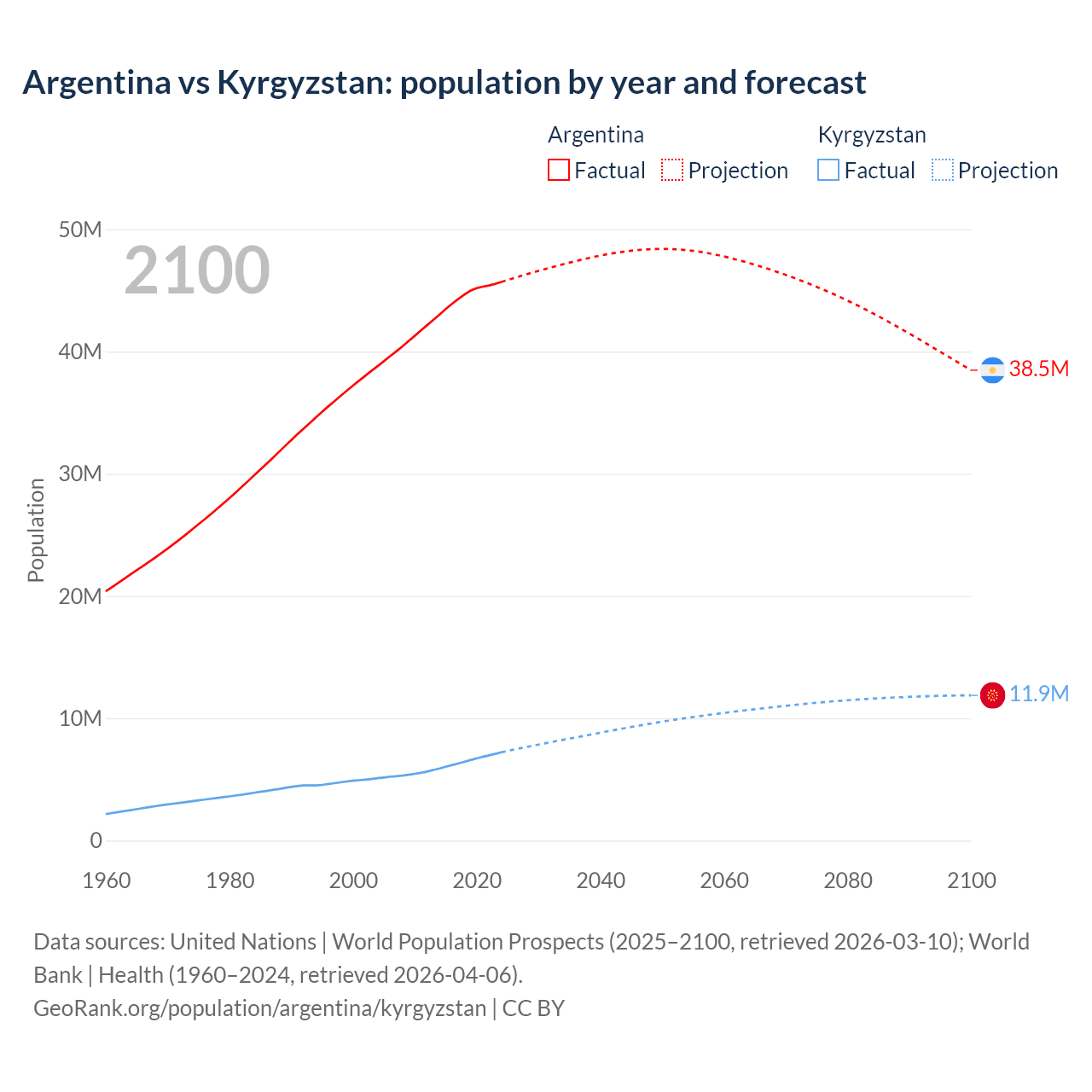 The latest officially reported population of Argentina was 45,696,159 in 2024 vs 7,221,868 people in Kyrgyzstan in 2024. In 2026, based on the adjusted UN estimation, the current Argentina's population is 46,048,053 people compared to 7,471,102 in Kyrgyzstan.