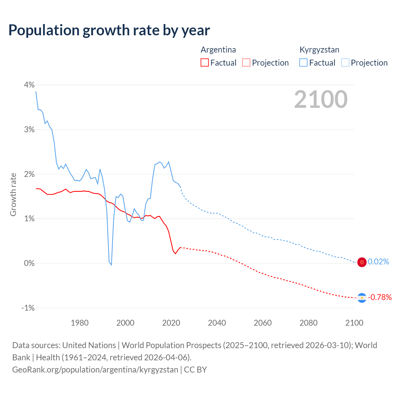 - For the last 10 years, Argentina has had an average growth rate of +0.64% per year vs +2.05% in Kyrgyzstan.