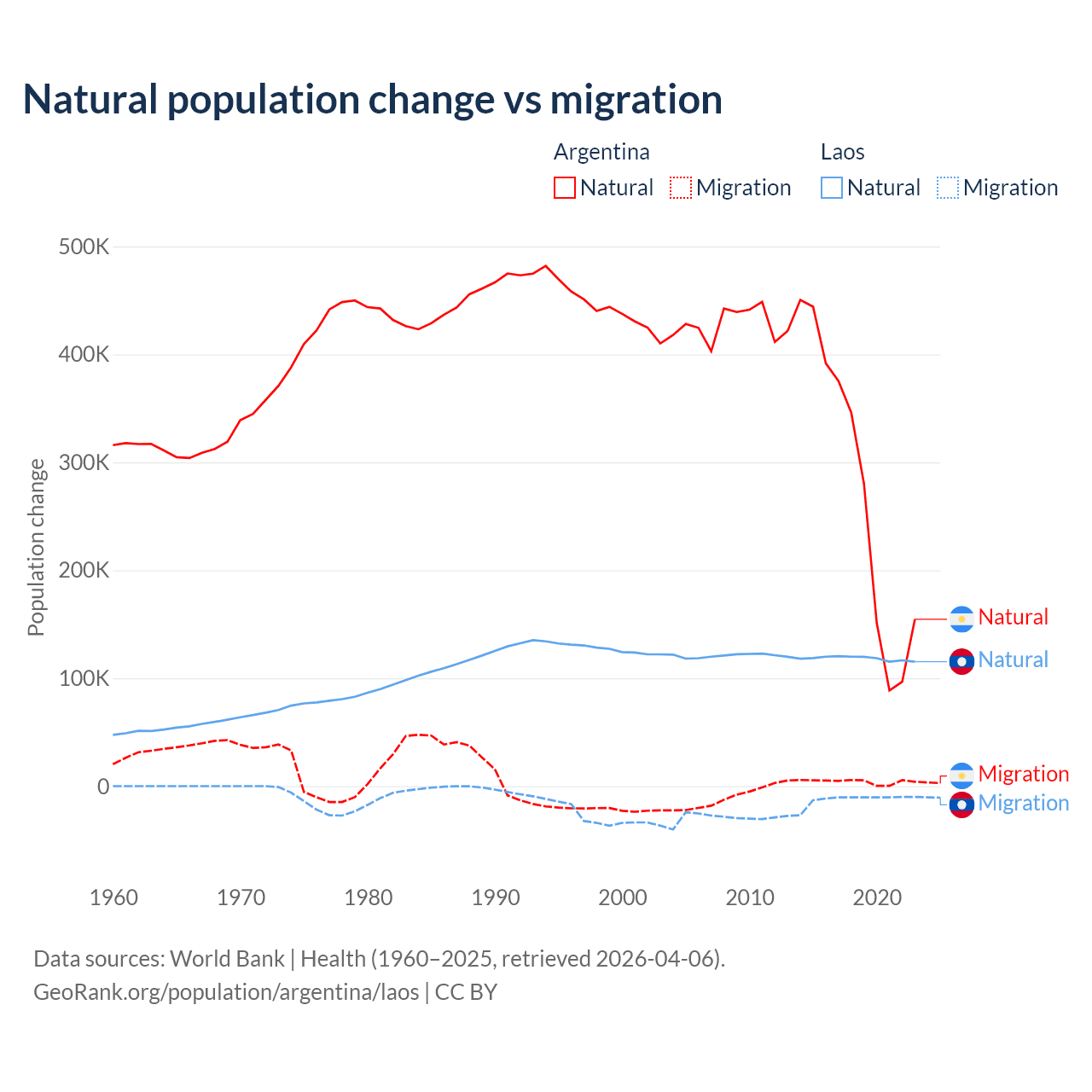 Over the last 10 years, 98.5% of the population change in Argentina is from natural causes (a gain of 2,779,031 people) and 1.52% is from migration (a gain of 42,871 people). In Laos 90.6% is from natural causes (a gain of 1,183,013 people) and 9.41% is from migration (a loss of 122,899 people).