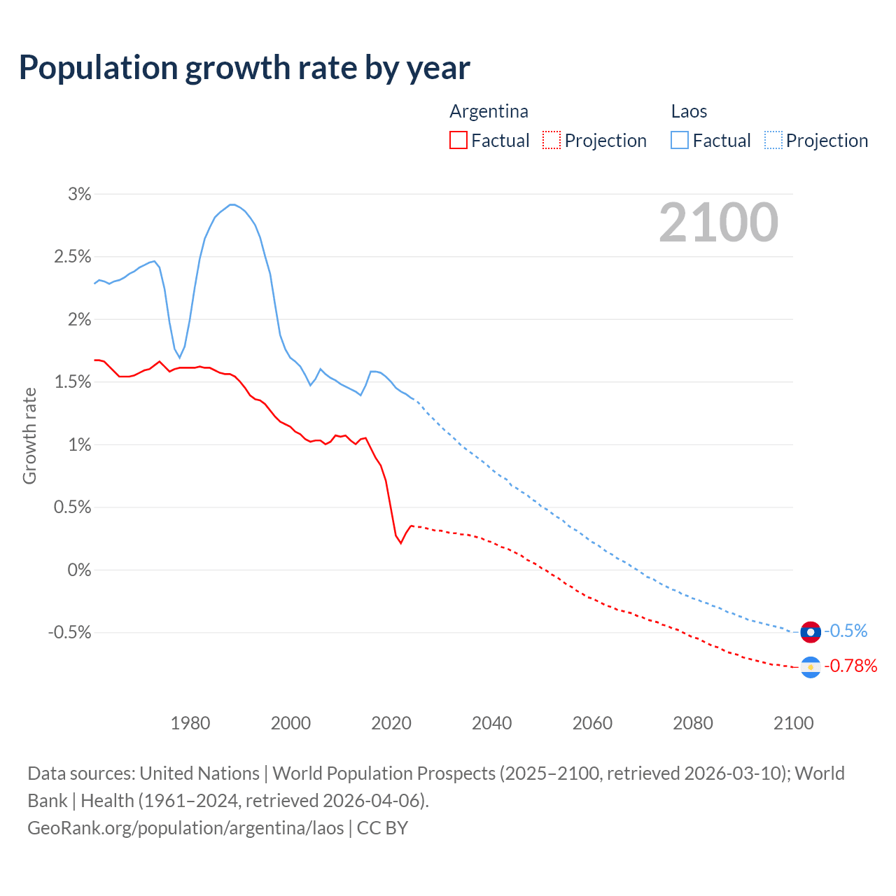 - For the last 10 years, Argentina has had an average growth rate of +0.64% per year vs +1.48% in Laos.