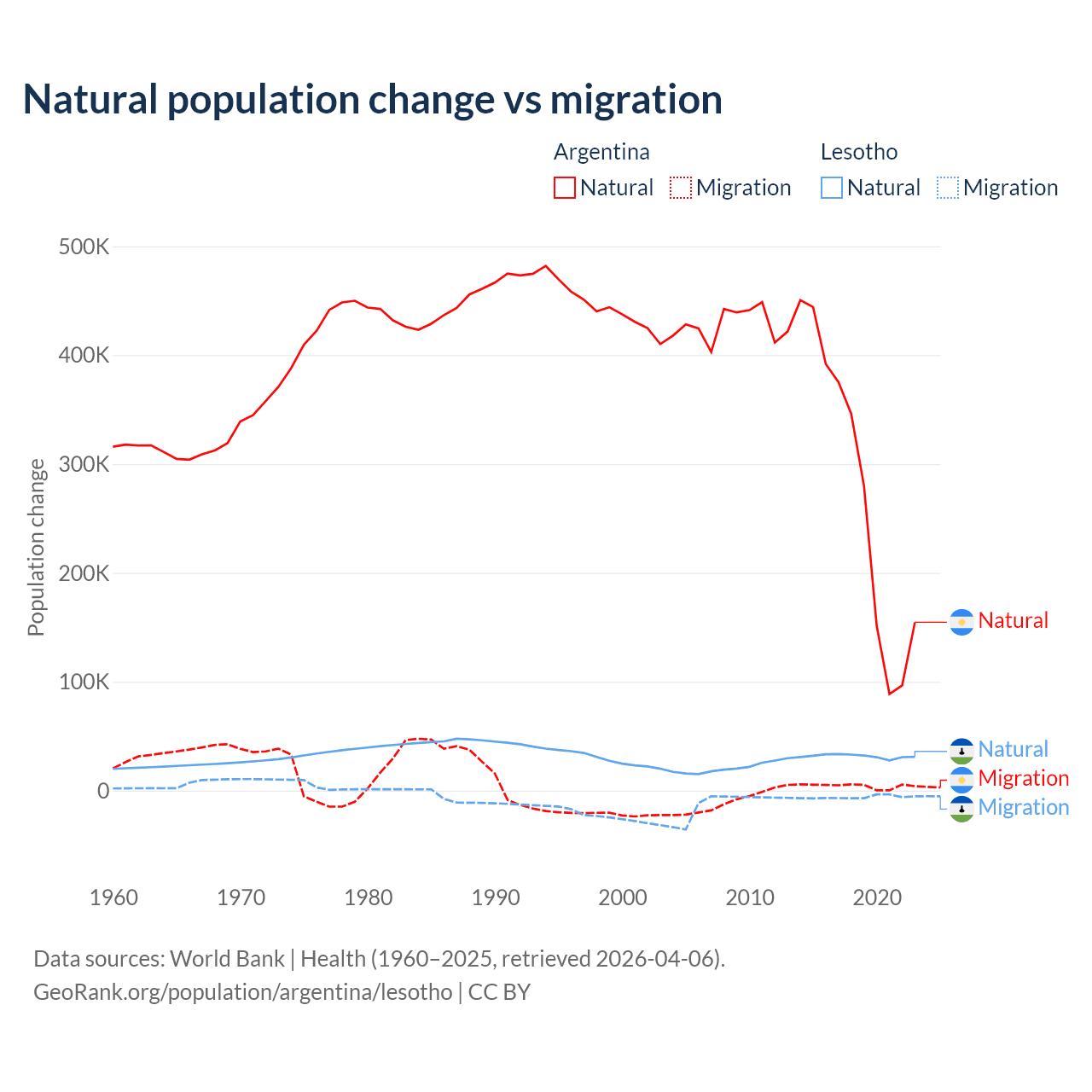 Over the last 10 years, 98.5% of the population change in Argentina is from natural causes (a gain of 2,779,031 people) and 1.52% is from migration (a gain of 42,871 people). In Lesotho 84.2% is from natural causes (a gain of 315,836 people) and 15.8% is from migration (a loss of 59,457 people).