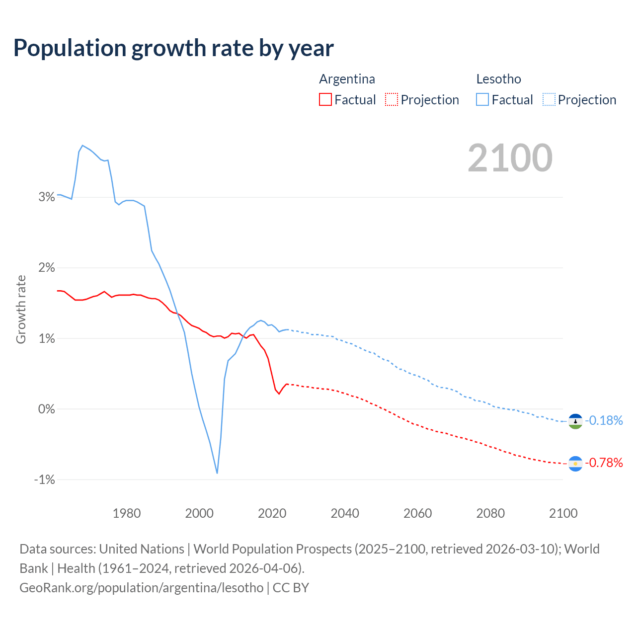 - For the last 10 years, Argentina has had an average growth rate of +0.64% per year vs +1.17% in Lesotho.