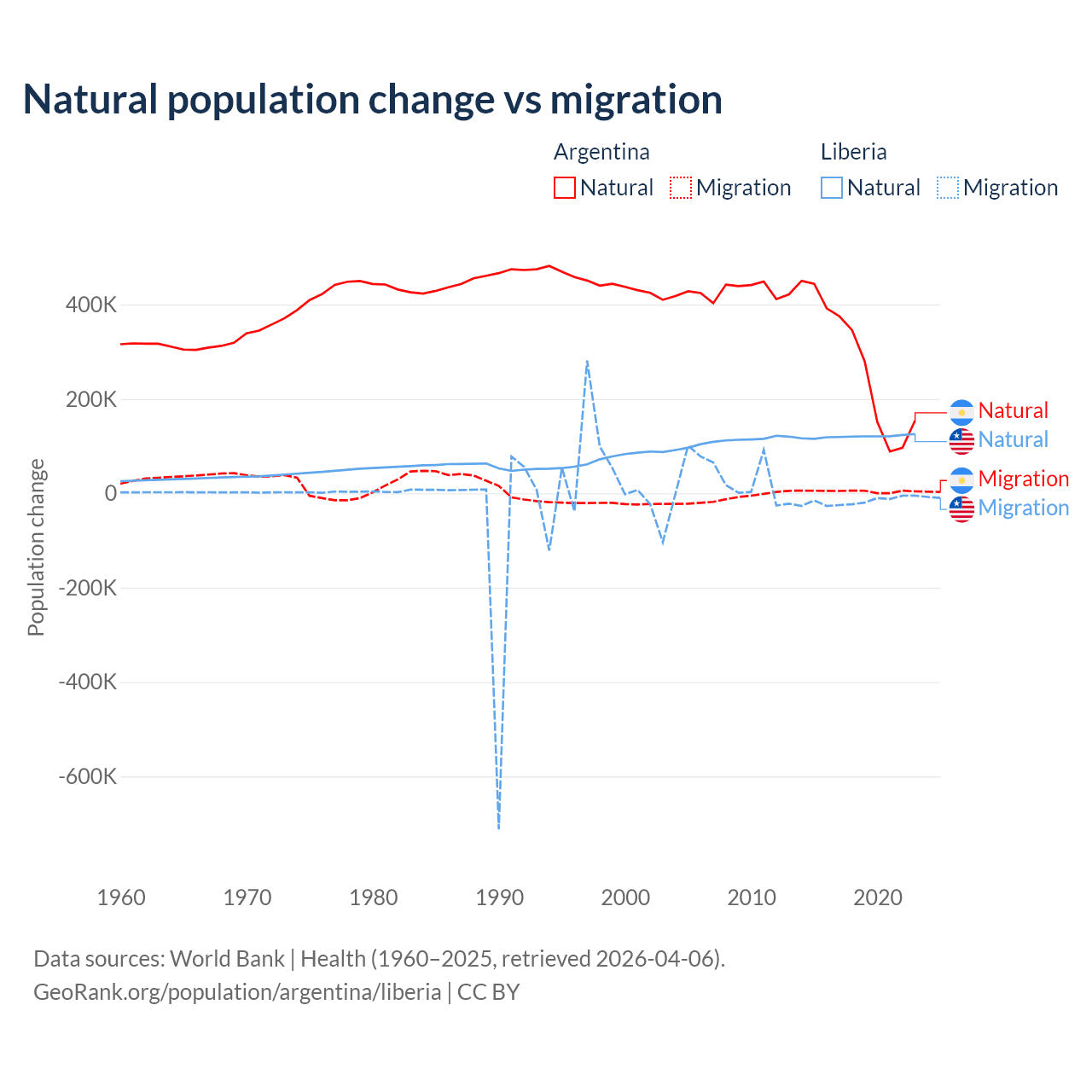 Over the last 10 years, 98.5% of the population change in Argentina is from natural causes (a gain of 2,779,031 people) and 1.52% is from migration (a gain of 42,871 people). In Liberia 87.7% is from natural causes (a gain of 1,202,387 people) and 12.3% is from migration (a loss of 168,316 people).