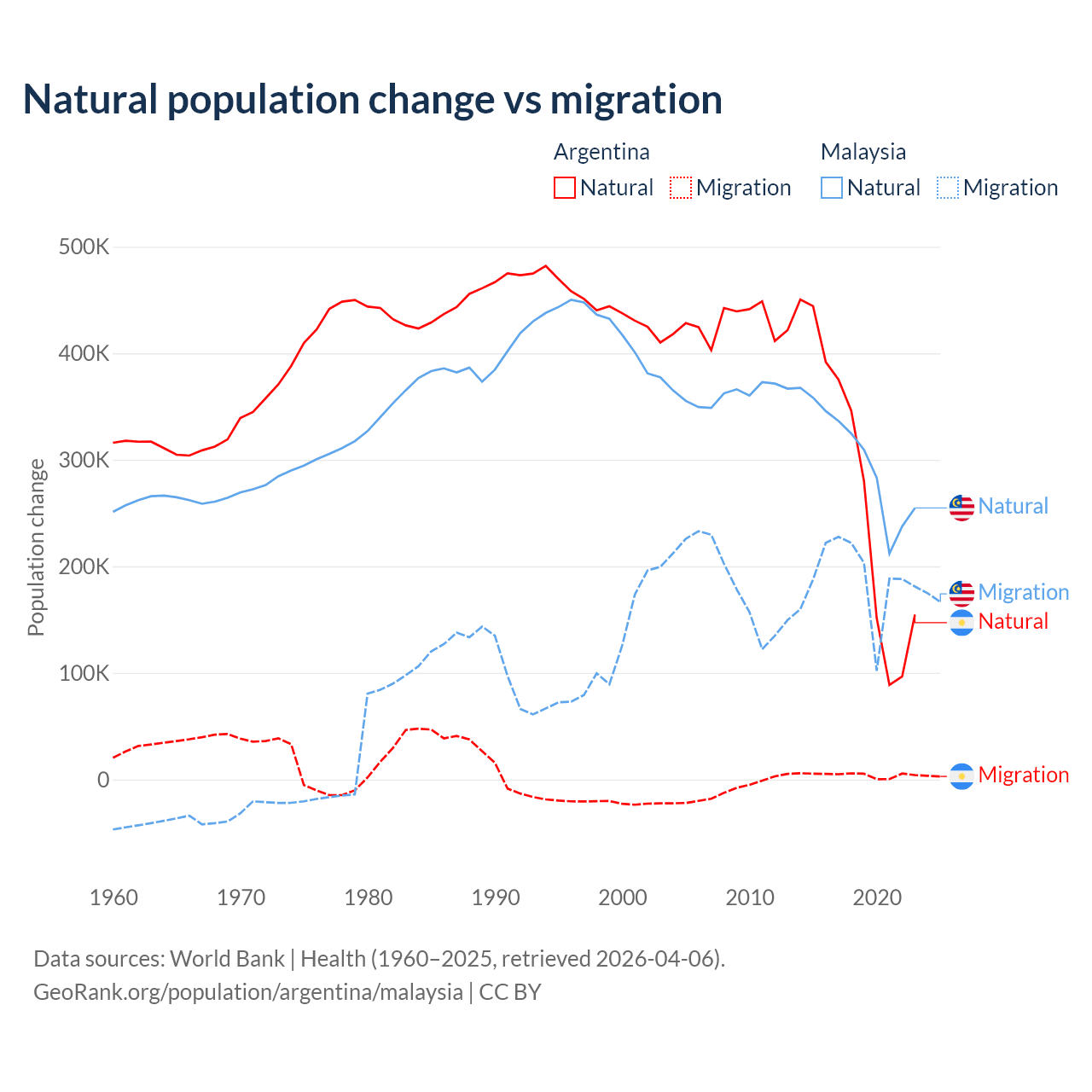 Over the last 10 years, 98.5% of the population change in Argentina is from natural causes (a gain of 2,779,031 people) and 1.52% is from migration (a gain of 42,871 people). In Malaysia 61.7% is from natural causes (a gain of 3,029,648 people) and 38.3% is from migration (a gain of 1,882,159 people).