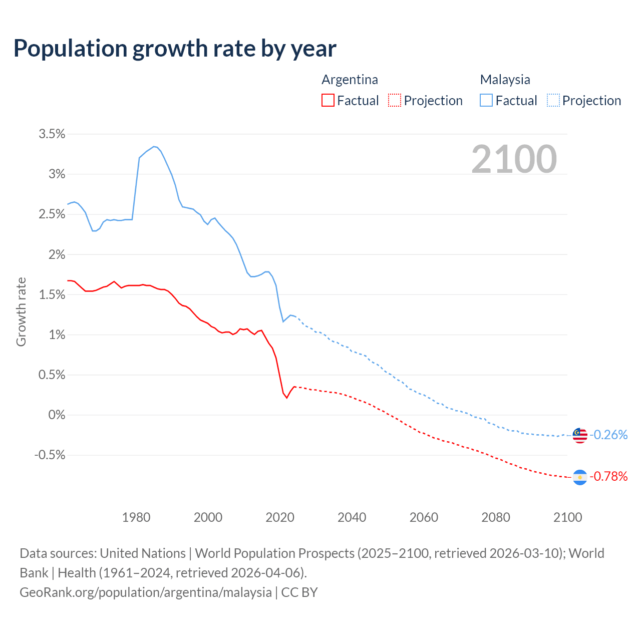 - For the last 10 years, Argentina has had an average growth rate of +0.64% per year vs +1.5% in Malaysia.