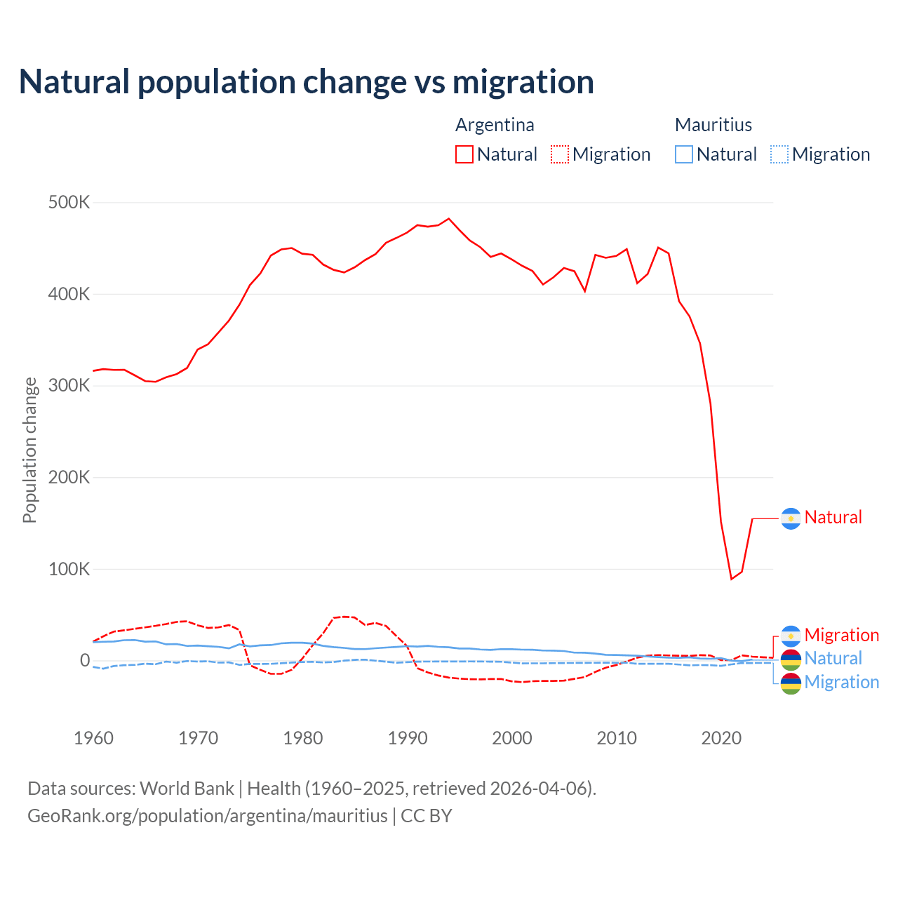 Over the last 10 years, 98.5% of the population change in Argentina is from natural causes (a gain of 2,779,031 people) and 1.52% is from migration (a gain of 42,871 people). In Mauritius 30.9% is from natural causes (a gain of 19,327 people) and 69.1% is from migration (a loss of 43,294 people).