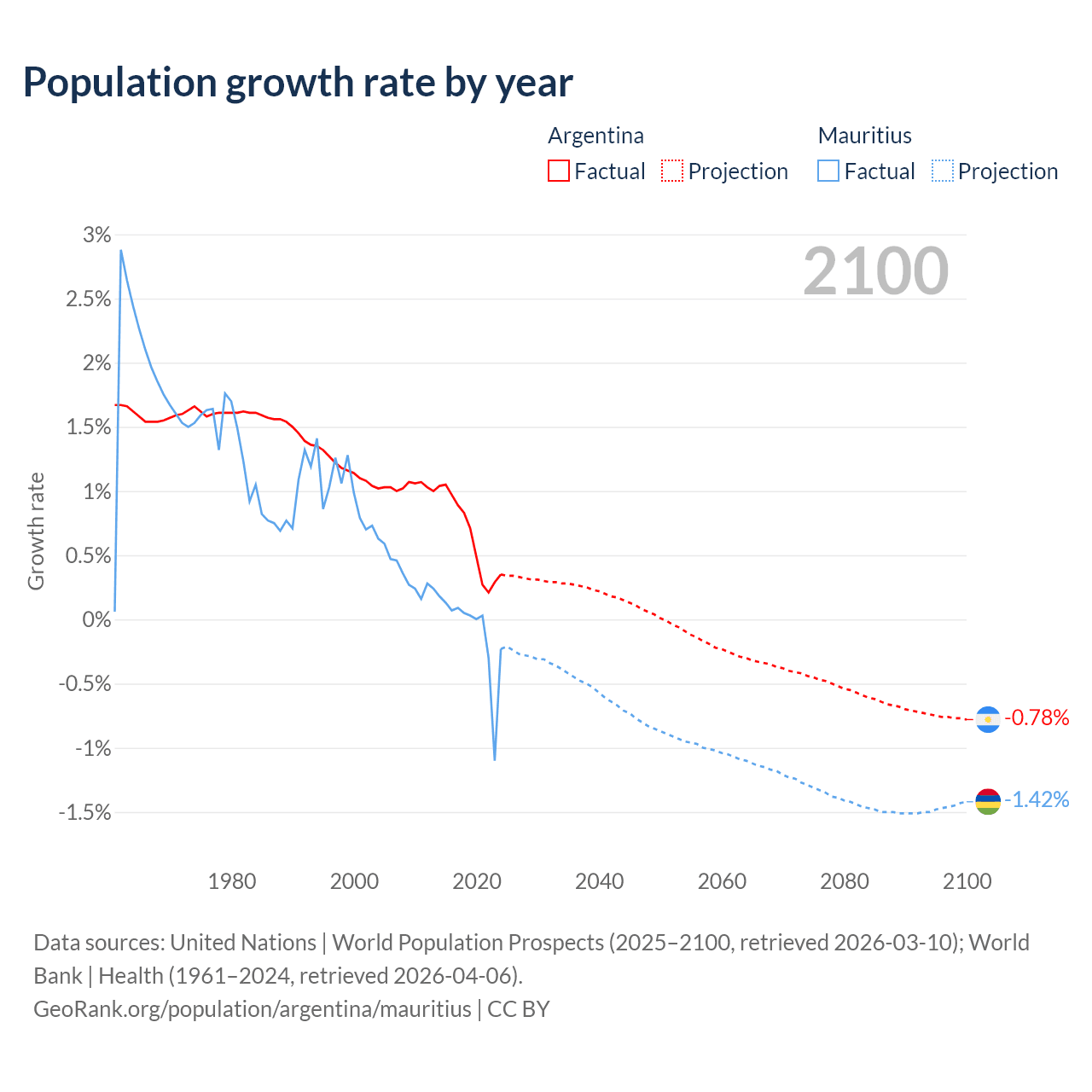 Argentina vs Mauritius: population by year and forecast