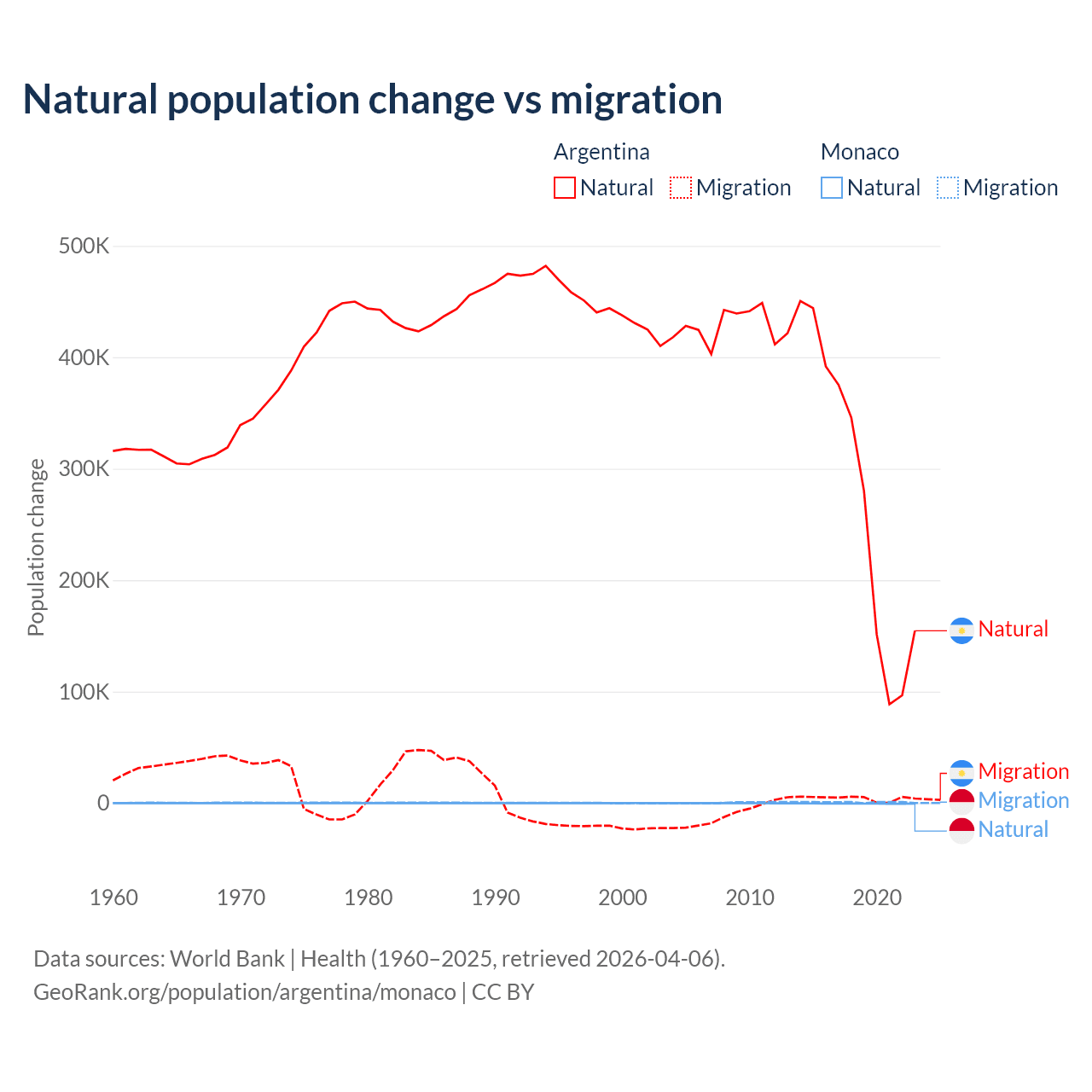 Over the last 10 years, 98.5% of the population change in Argentina is from natural causes (a gain of 2,779,031 people) and 1.52% is from migration (a gain of 42,871 people). In Monaco 37.3% is from natural causes (a loss of 4,357 people) and 62.7% is from migration (a gain of 7,333 people).