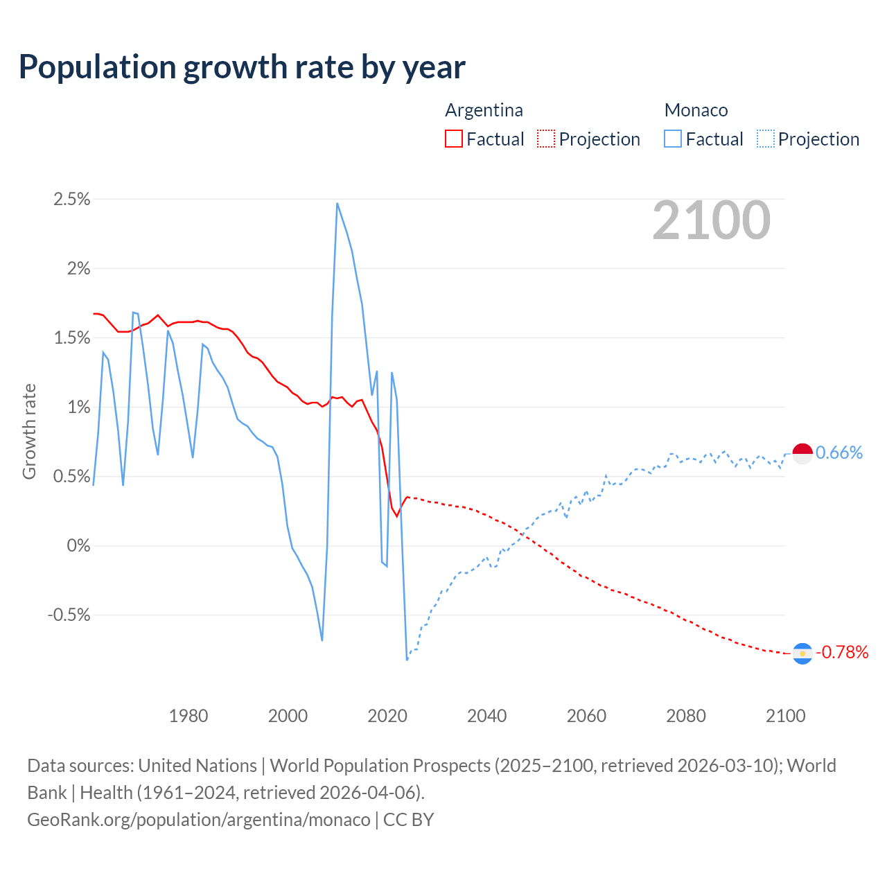 Argentina vs Monaco: population by year and forecast
