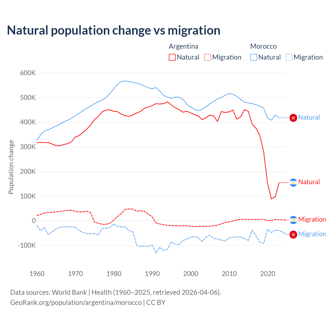 Over the last 10 years, 98.5% of the population change in Argentina is from natural causes (a gain of 2,779,031 people) and 1.52% is from migration (a gain of 42,871 people). In Morocco 88.3% is from natural causes (a gain of 4,495,223 people) and 11.7% is from migration (a loss of 594,083 people).
