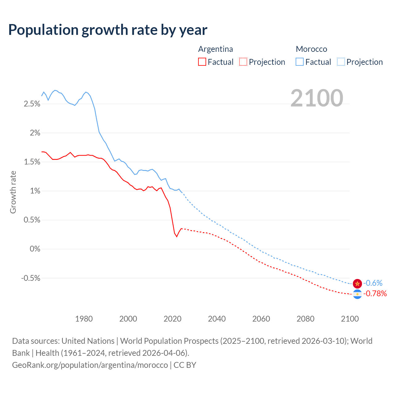 - For the last 10 years, Argentina has had an average growth rate of +0.64% per year vs +1.09% in Morocco.