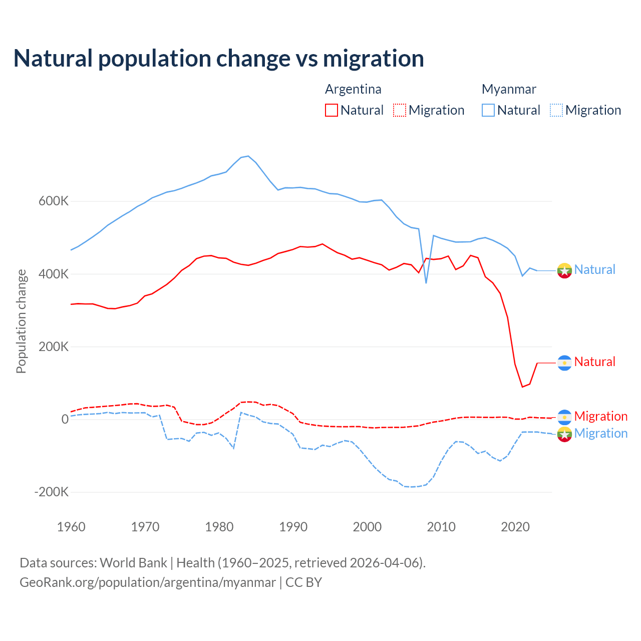 Over the last 10 years, 98.5% of the population change in Argentina is from natural causes (a gain of 2,779,031 people) and 1.52% is from migration (a gain of 42,871 people). In Myanmar 86% is from natural causes (a gain of 4,594,615 people) and 14% is from migration (a loss of 749,272 people).
