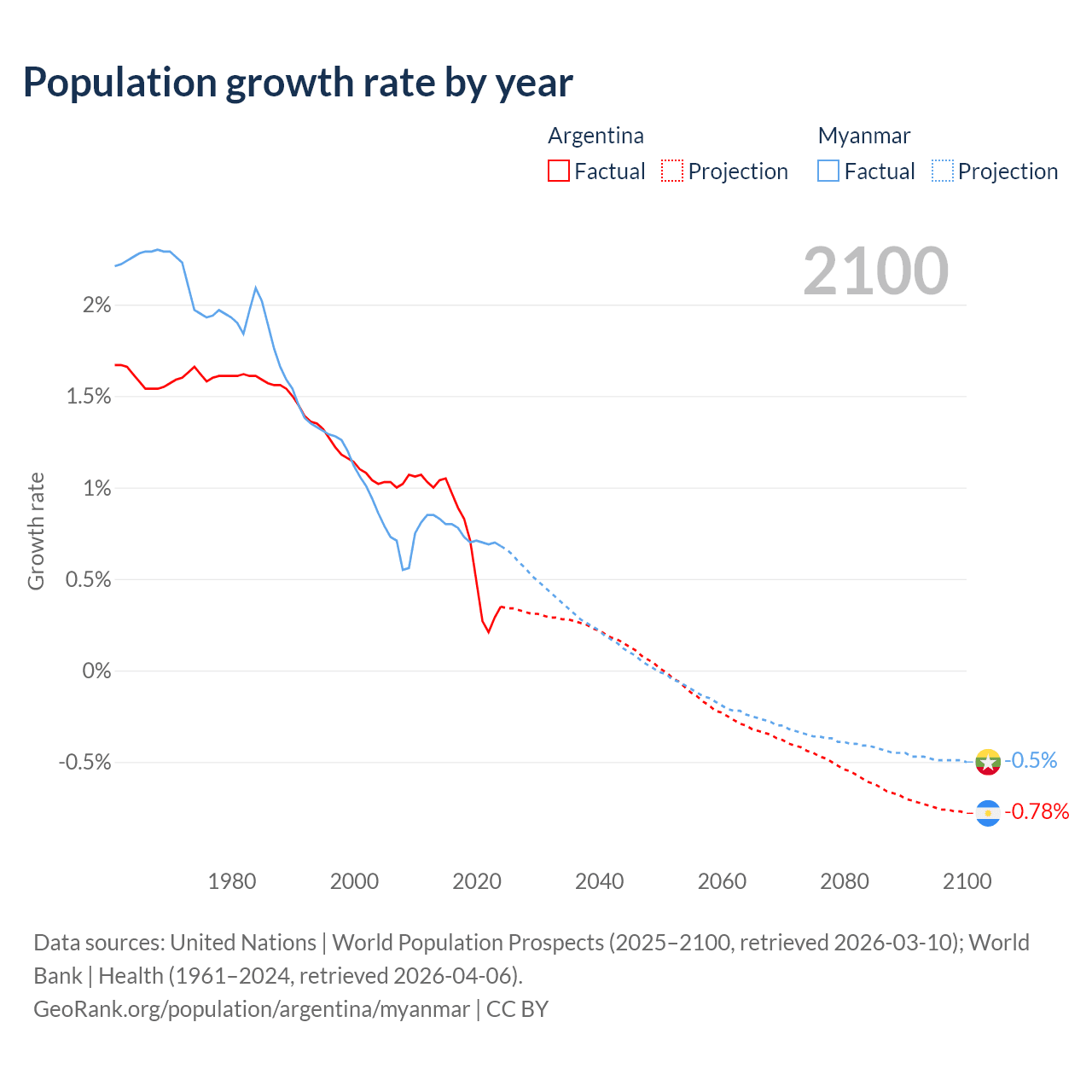 - For the last 10 years, Argentina has had an average growth rate of +0.64% per year vs +0.74% in Myanmar.