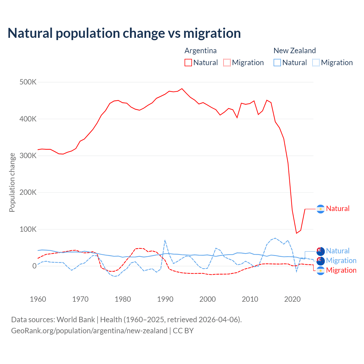 Over the last 10 years, 98.5% of the population change in Argentina is from natural causes (a gain of 2,779,031 people) and 1.52% is from migration (a gain of 42,871 people). In New Zealand 34.4% is from natural causes (a gain of 247,767 people) and 65.6% is from migration (a gain of 471,602 people).