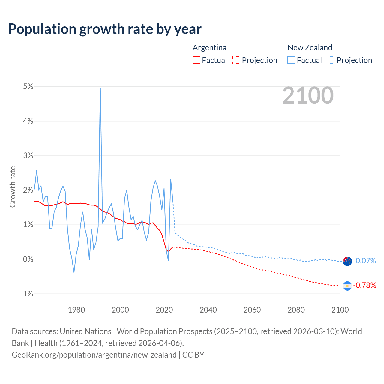 - For the last 10 years, Argentina has had an average growth rate of +0.64% per year vs +1.6% in New Zealand.
