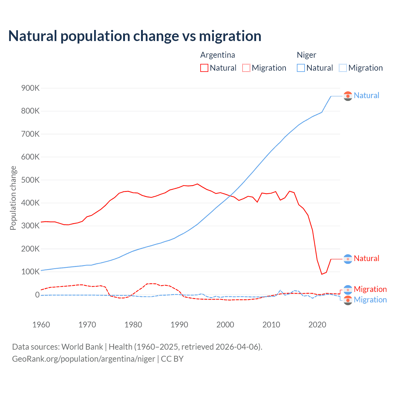 Over the last 10 years, 98.5% of the population change in Argentina is from natural causes (a gain of 2,779,031 people) and 1.52% is from migration (a gain of 42,871 people). In Niger 100% is from natural causes (a gain of 7,728,287 people) and 0.03% is from migration (a gain of 2,520 people).