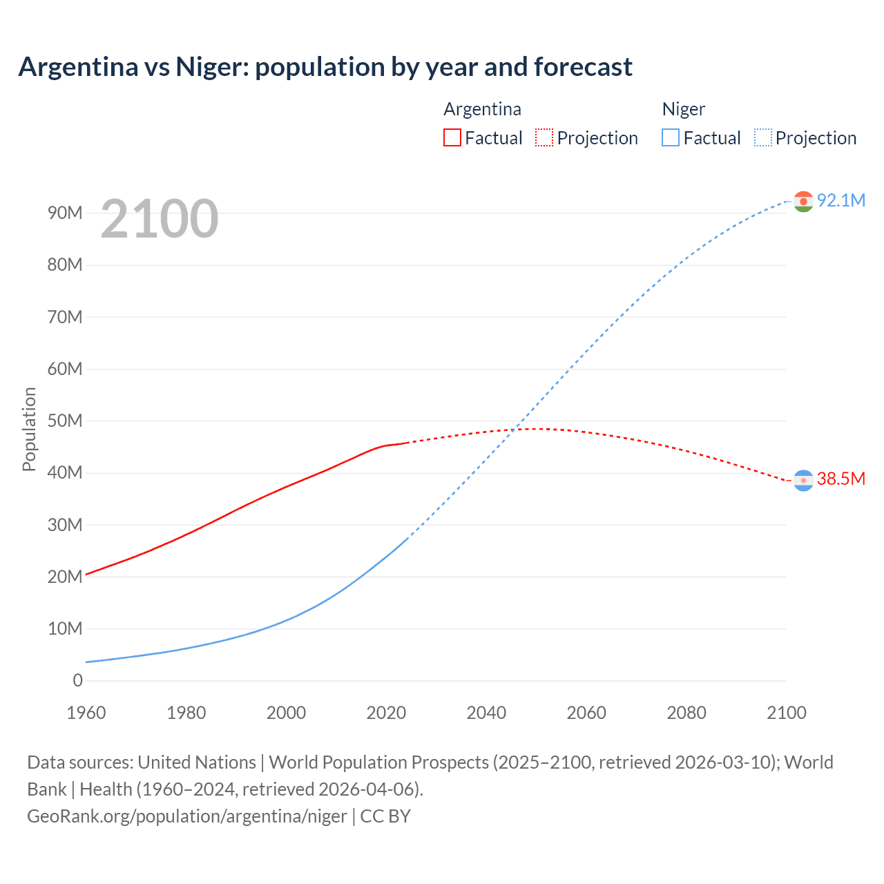 The latest officially reported population of Argentina was 45,696,159 in 2024 vs 27,032,412 people in Niger in 2024. In 2026, based on the adjusted UN estimation, the current Argentina's population is 46,048,053 people compared to 29,080,898 in Niger.
