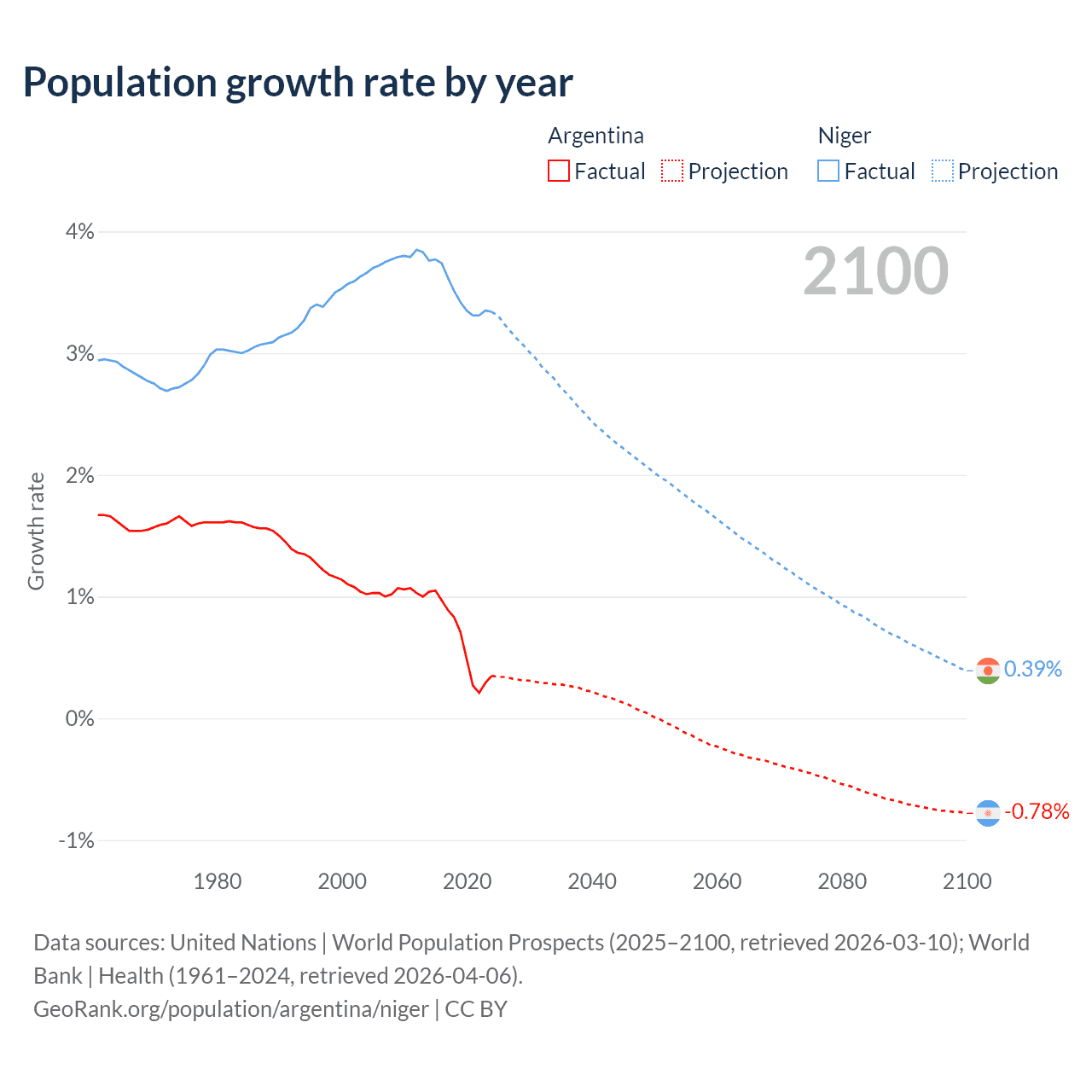 - For the last 10 years, Argentina has had an average growth rate of +0.64% per year vs +3.5% in Niger.