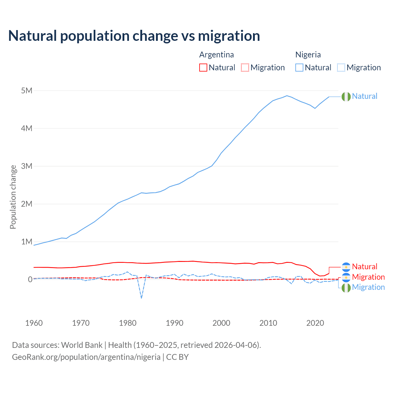 Over the last 10 years, 98.5% of the population change in Argentina is from natural causes (a gain of 2,779,031 people) and 1.52% is from migration (a gain of 42,871 people). In Nigeria 99.2% is from natural causes (a gain of 47,163,517 people) and 0.77% is from migration (a loss of 368,103 people).