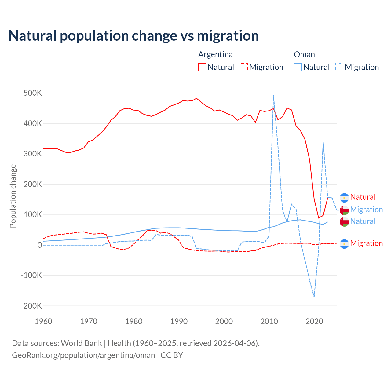 Over the last 10 years, 98.5% of the population change in Argentina is from natural causes (a gain of 2,779,031 people) and 1.52% is from migration (a gain of 42,871 people). In Oman 61.6% is from natural causes (a gain of 763,049 people) and 38.4% is from migration (a gain of 475,565 people).