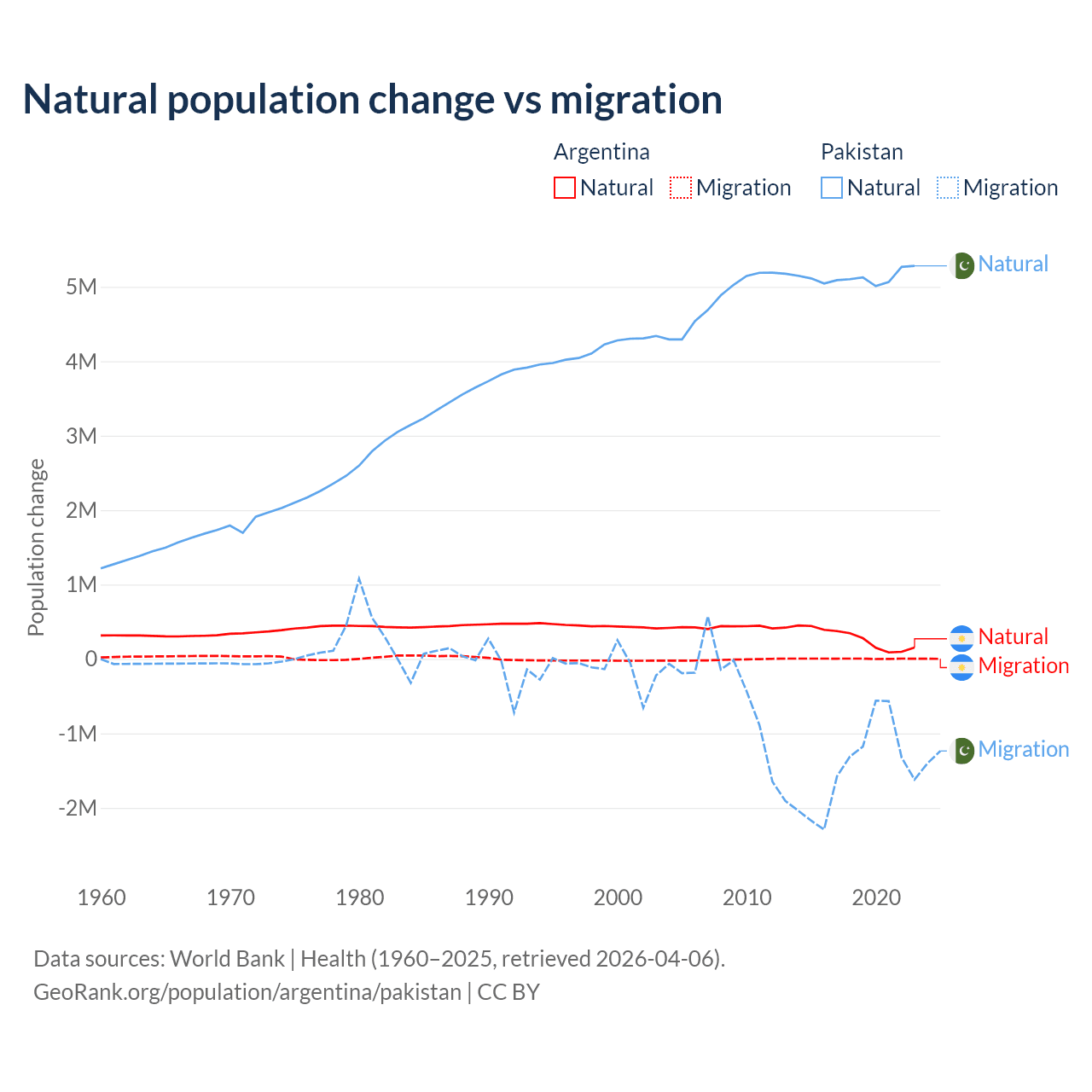 Over the last 10 years, 98.5% of the population change in Argentina is from natural causes (a gain of 2,779,031 people) and 1.52% is from migration (a gain of 42,871 people). In Pakistan 77.8% is from natural causes (a gain of 51,255,404 people) and 22.2% is from migration (a loss of 14,629,055 people).