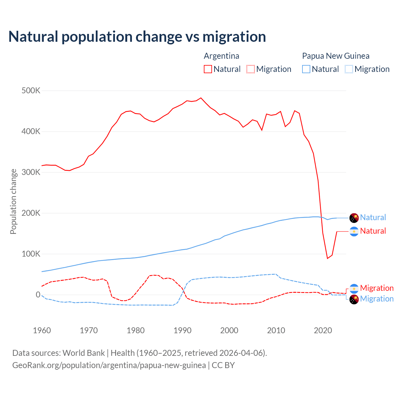 Over the last 10 years, 98.5% of the population change in Argentina is from natural causes (a gain of 2,779,031 people) and 1.52% is from migration (a gain of 42,871 people). In Papua New Guinea 91% is from natural causes (a gain of 1,883,906 people) and 8.98% is from migration (a gain of 185,900 people).