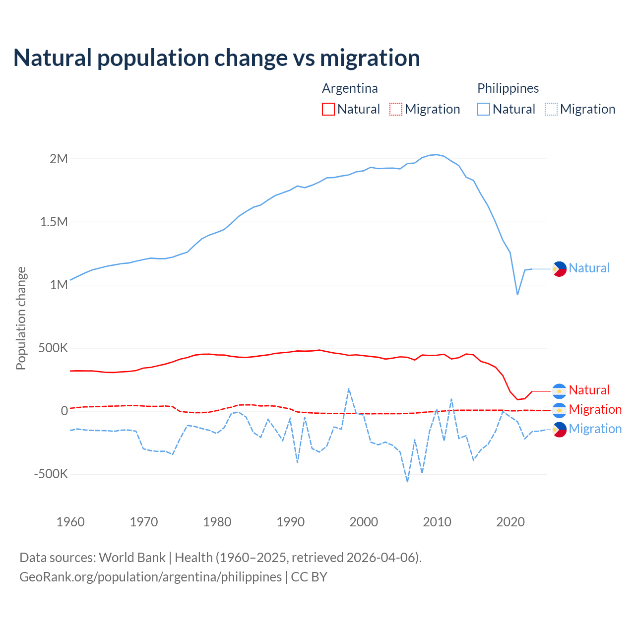 Over the last 10 years, 98.5% of the population change in Argentina is from natural causes (a gain of 2,779,031 people) and 1.52% is from migration (a gain of 42,871 people). In the Philippines 88.5% is from natural causes (a gain of 14,279,705 people) and 11.5% is from migration (a loss of 1,848,117 people).