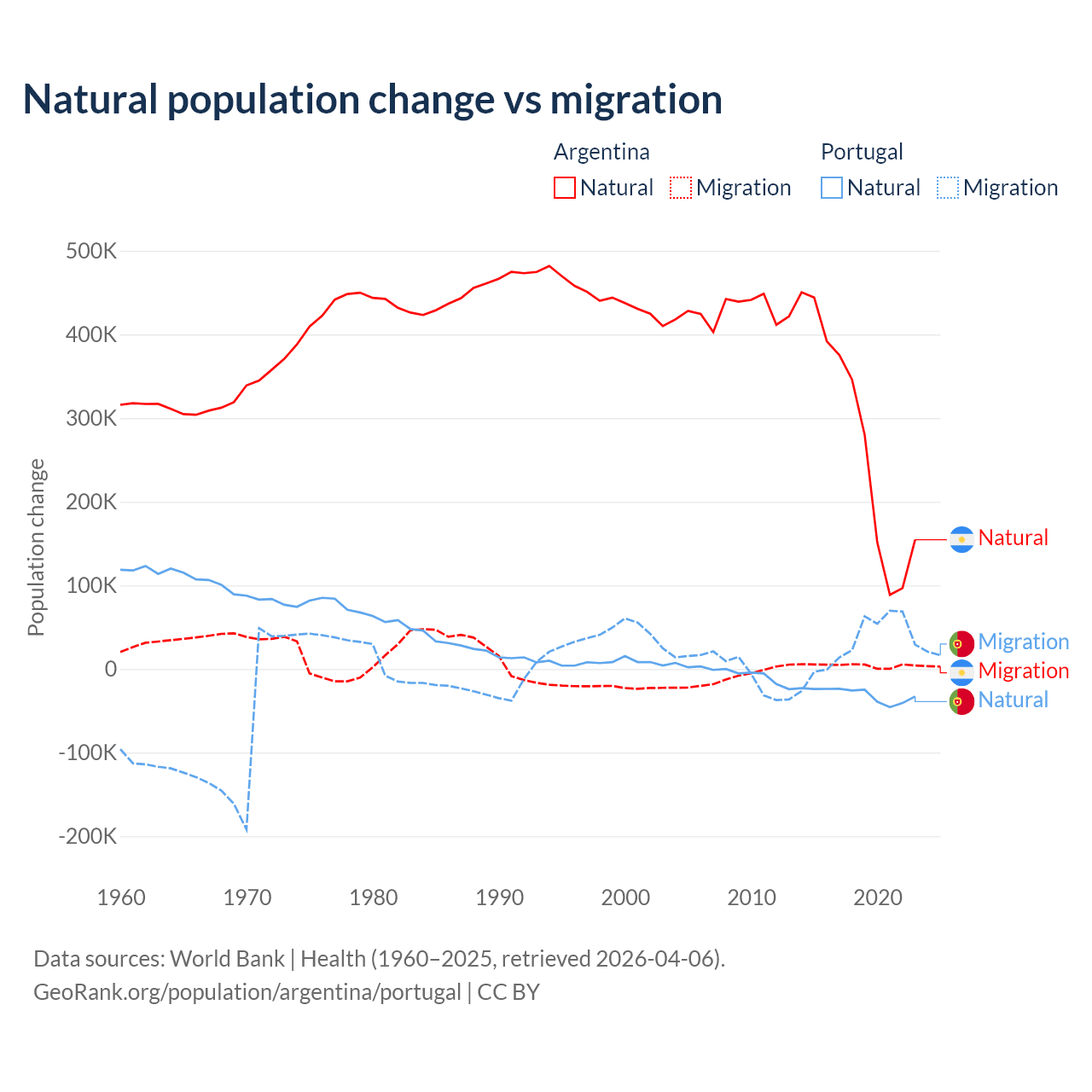 Over the last 10 years, 98.5% of the population change in Argentina is from natural causes (a gain of 2,779,031 people) and 1.52% is from migration (a gain of 42,871 people). In Portugal 51% is from natural causes (a loss of 302,748 people) and 49% is from migration (a gain of 290,554 people).