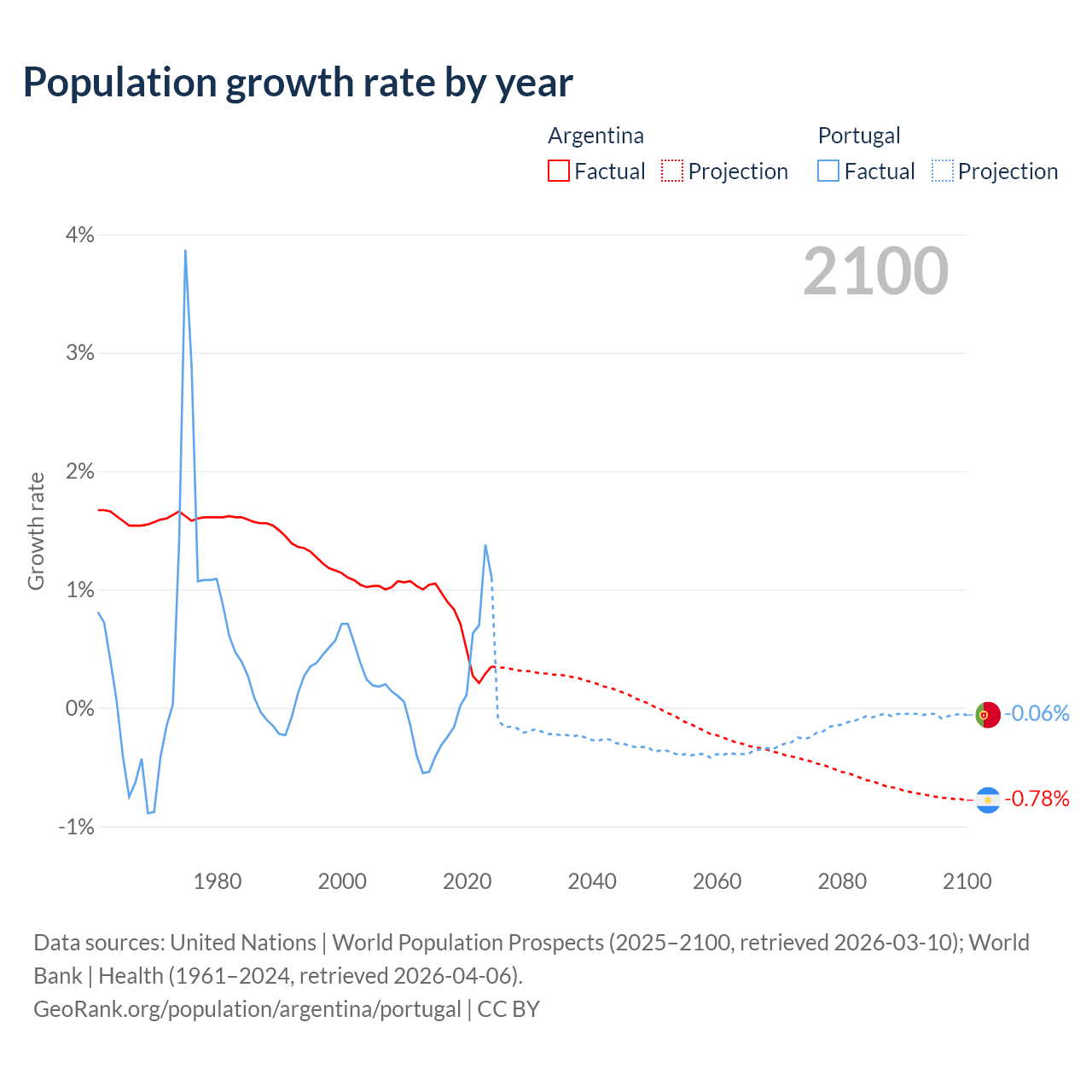 - For the last 10 years, Argentina has had an average growth rate of +0.64% per year vs +0.21% in Portugal.