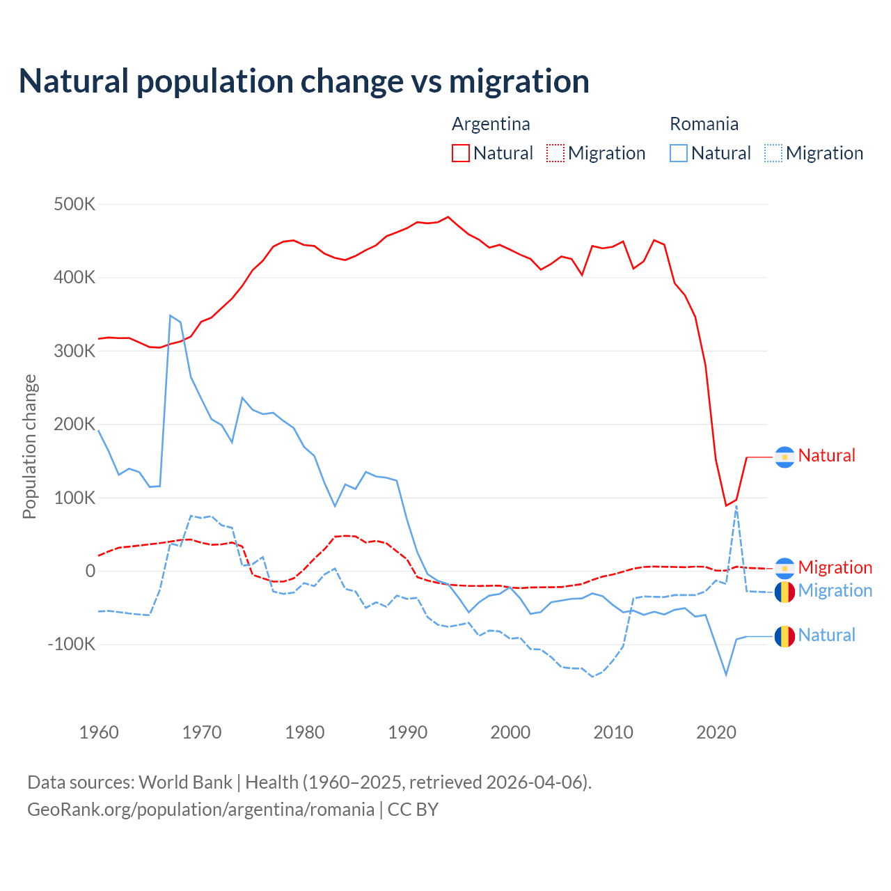 Over the last 10 years, 98.5% of the population change in Argentina is from natural causes (a gain of 2,779,031 people) and 1.52% is from migration (a gain of 42,871 people). In Romania 82% is from natural causes (a loss of 766,295 people) and 18% is from migration (a loss of 167,917 people).