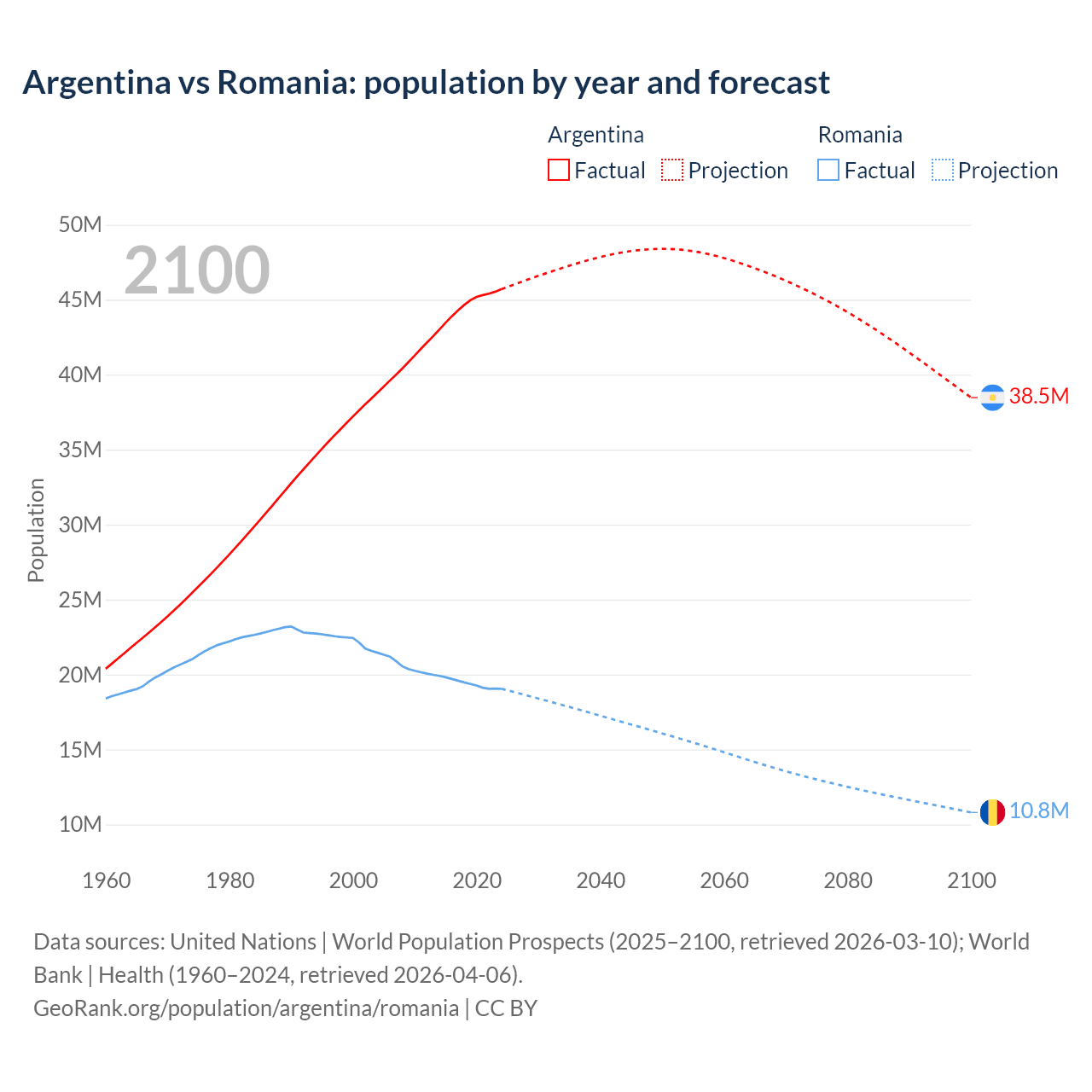 The latest officially reported population of Argentina was 45,696,159 in 2024 vs 19,051,804 people in Romania in 2024. In 2026, based on the adjusted UN estimation, the current Argentina's population is 46,048,053 people compared to 18,839,108 in Romania.