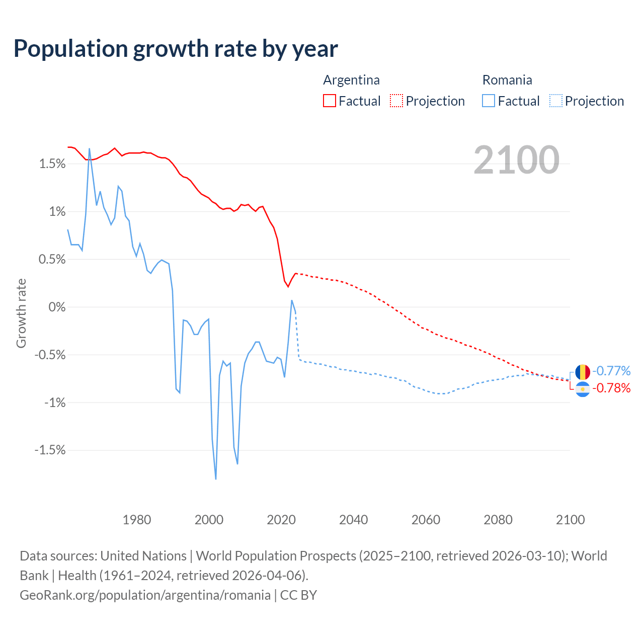 - For the last 10 years, Argentina has had an average growth rate of +0.64% per year vs -0.43% in Romania.